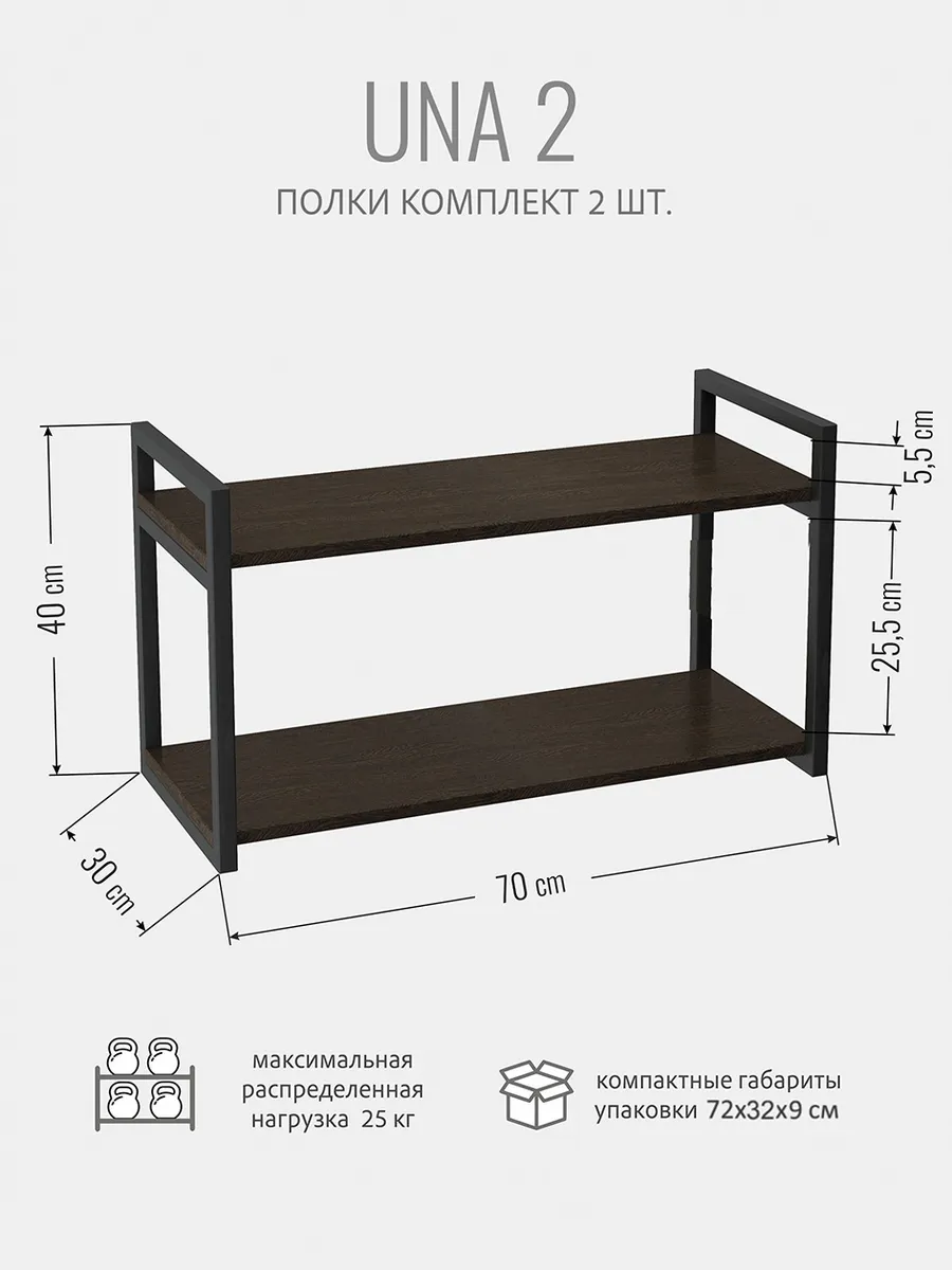 Полка прямая металлическая навесная изготовлена из прочного усиленного металлического каркаса 20х20 мм, окрашенный черной порошковой краской. Железные кронштейны выдерживают распределенную нагрузку до 25 кг на каждую полку, что делает комплект надежным помощником в любой обстановке. Полочки изготовлены из высококачественного ЛДСП, покрытое влагозащитным ламинированным покрытием, устойчивым к царапинам и легко моется.