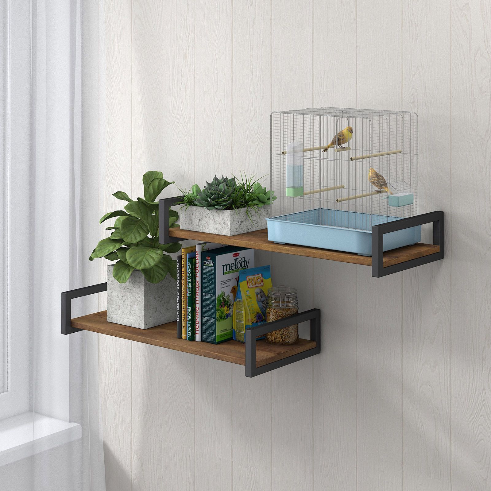 Полка прямая металлическая навесная изготовлена из прочного усиленного металлического каркаса 20х20 мм, окрашенный черной порошковой краской. Железные кронштейны выдерживают распределенную нагрузку до 25 кг на каждую полку, что делает комплект надежным помощником в любой обстановке. Полочки изготовлены из высококачественного ЛДСП, покрытое влагозащитным ламинированным покрытием, устойчивым к царапинам и легко моется.