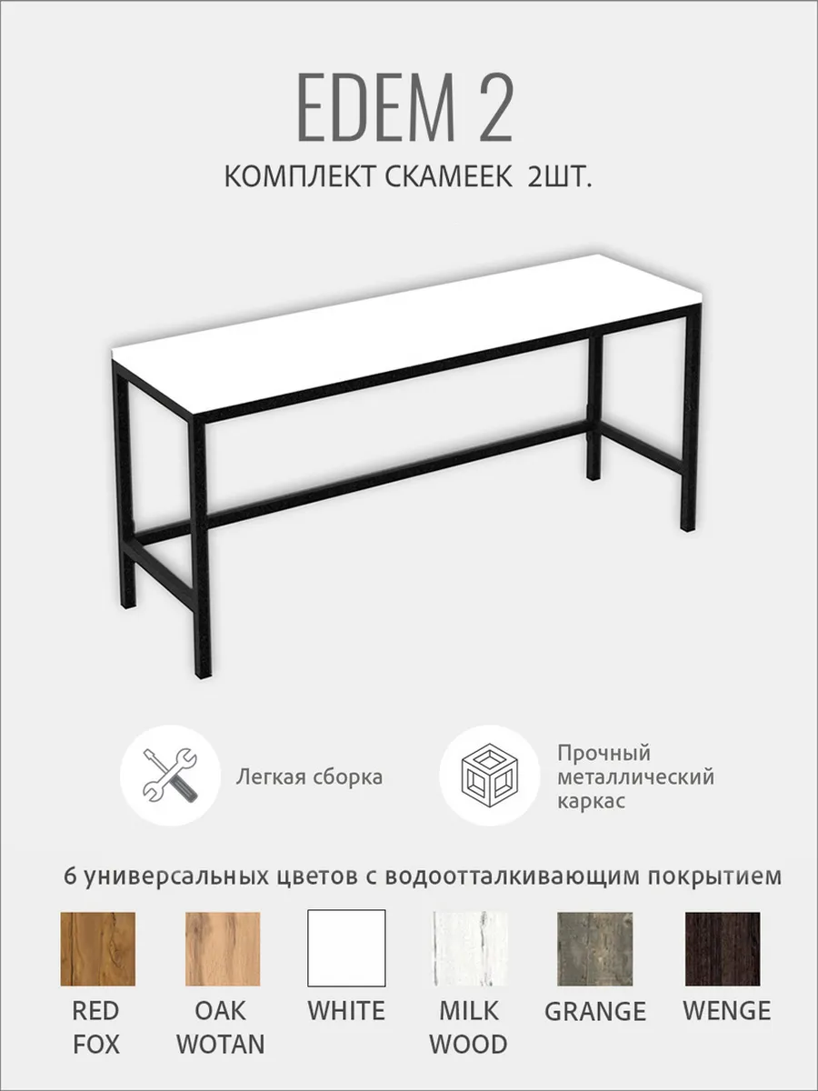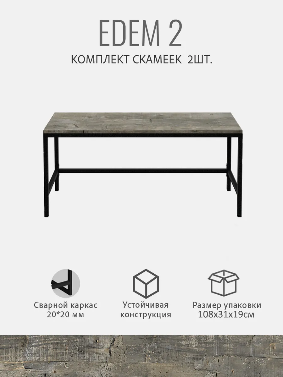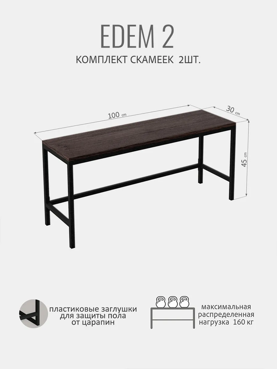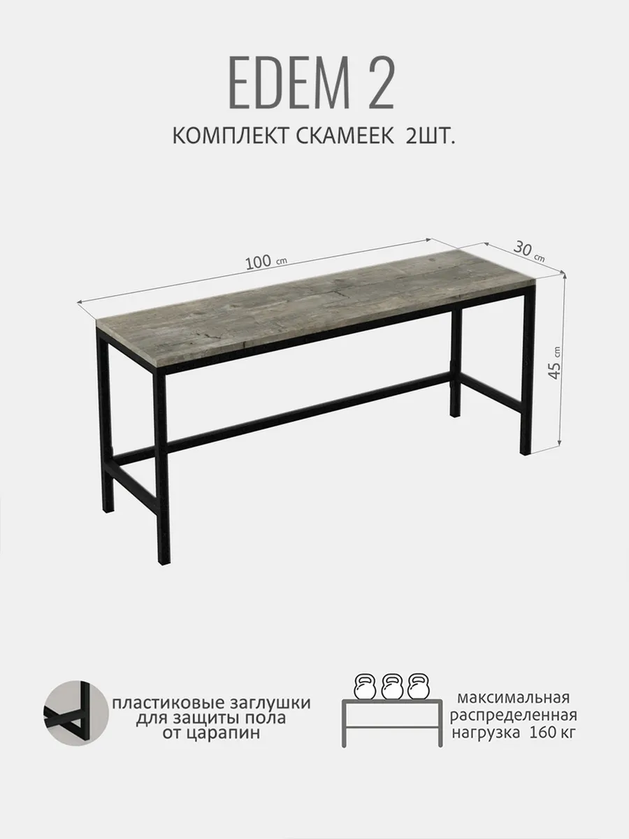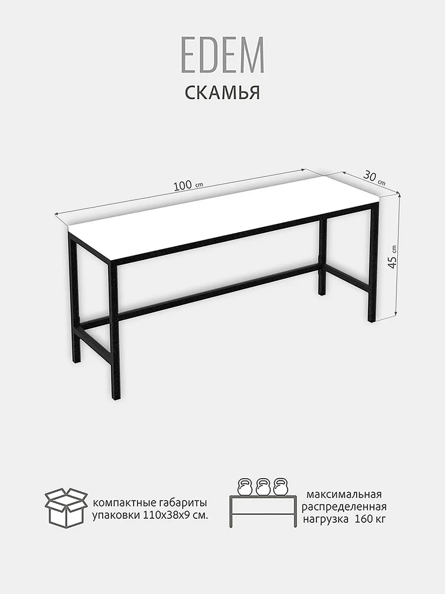 Каждая скамья EDEM металлическая с сиденьем из ЛДСП без спинки выполнена в стиле LOFT. Благодаря надежности лавочка может использоваться как для собственных нужд (на даче, дома, квартире, гараже) так и для массового использования в местах с большой проходимостью: раздевалки в фитнес центрах, офисе, в школе, примерочные, различные учебные и образовательные учреждения. Не предназначена для уличного использования. Скамейка деревянная - незаменимая вещь и отлично впишется в любой интерьер, как лавочка для бани, скамейка на балкон, скамейка для кухни. Лаконичный дизайн лавочки прекрасно сочетается с современной мебелью. Простая и комфортная лавка изготовлена из прочной стали и натурального дерева. Металлический каркас скамейки выполнен из профильной трубы 20х20 мм, металл окрашен порошковой черной матовой краской. Сиденье изготовлено из высококачественного ЛДСП, покрытое влагозащитным ламинированным покрытием, которое является водонепроницаемым, устойчивым к царапинам. Каркас состоит из траверсы, ножек и усиленной распорной перекладины, что позволяет ей выдерживать вес 160 кг. Высота, ширина и глубина подобраны так, чтобы взрослым и детям было удобно и комфортно сидеть на скамейке. Размеры скамьи: длина-100см, глубина-30см, высота-45см. Скамейка-перевертыш эргономичная и легкая, поэтому ее без труда можно перемещать. Скамейка в стиле лофт поставляется в разобранном виде в 1 упаковке, комплект крепежа входит в комплектацию. Легкая и быстрая сборка.