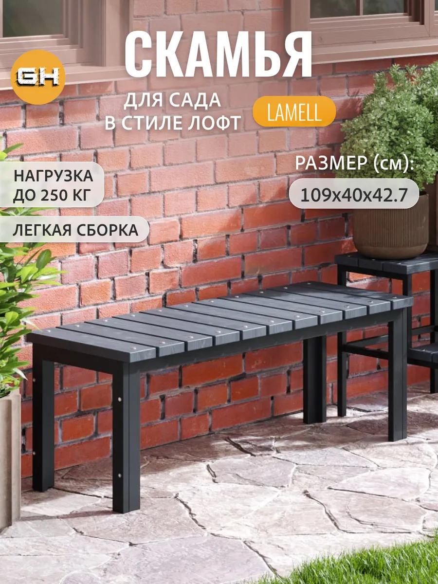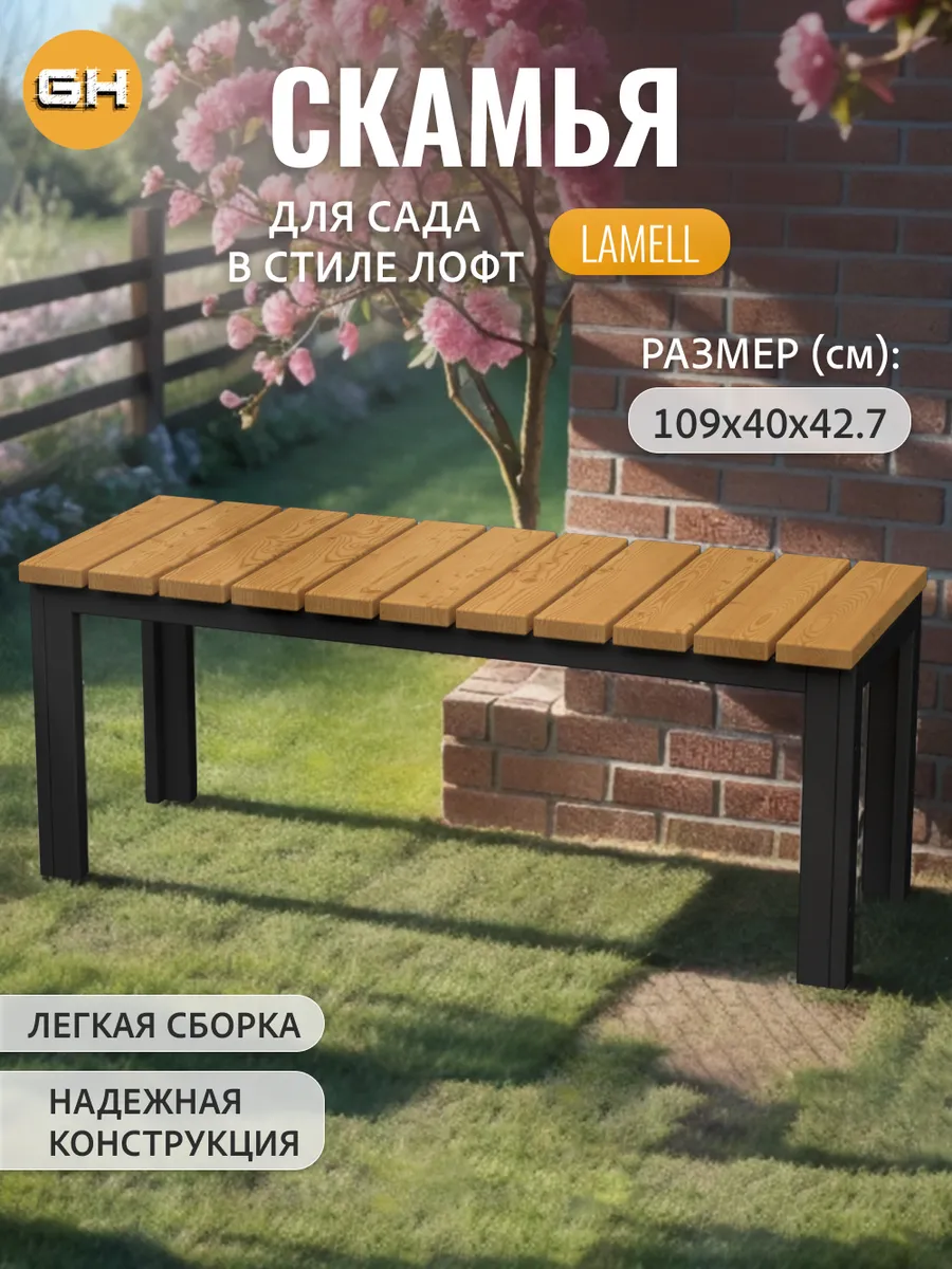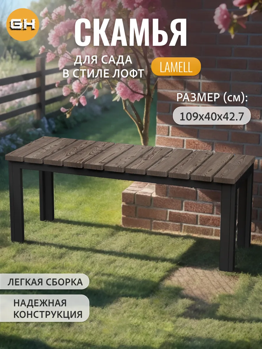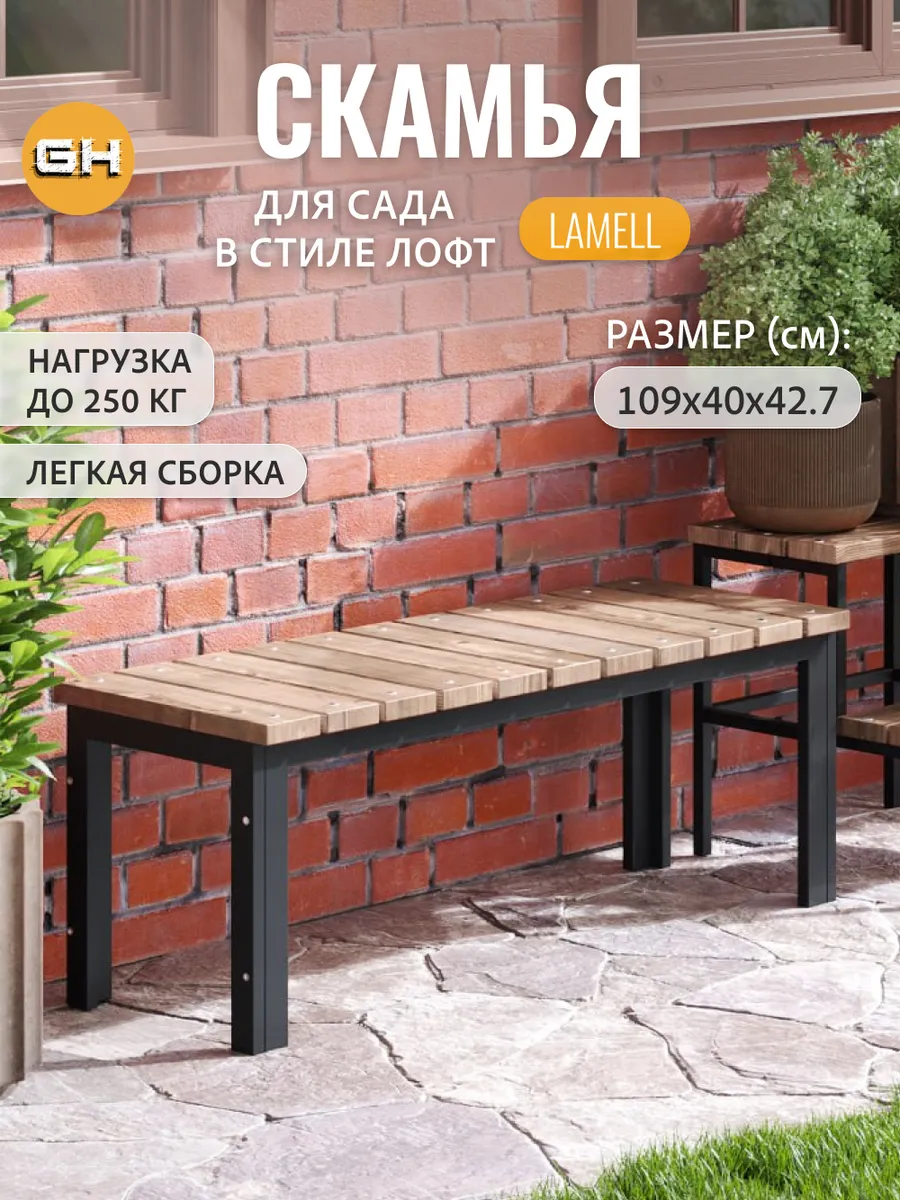 Лавка- скамья металлическая LAMELL в стиле лофт, уличная изготовлена из прочной стали и натурального дерева.
