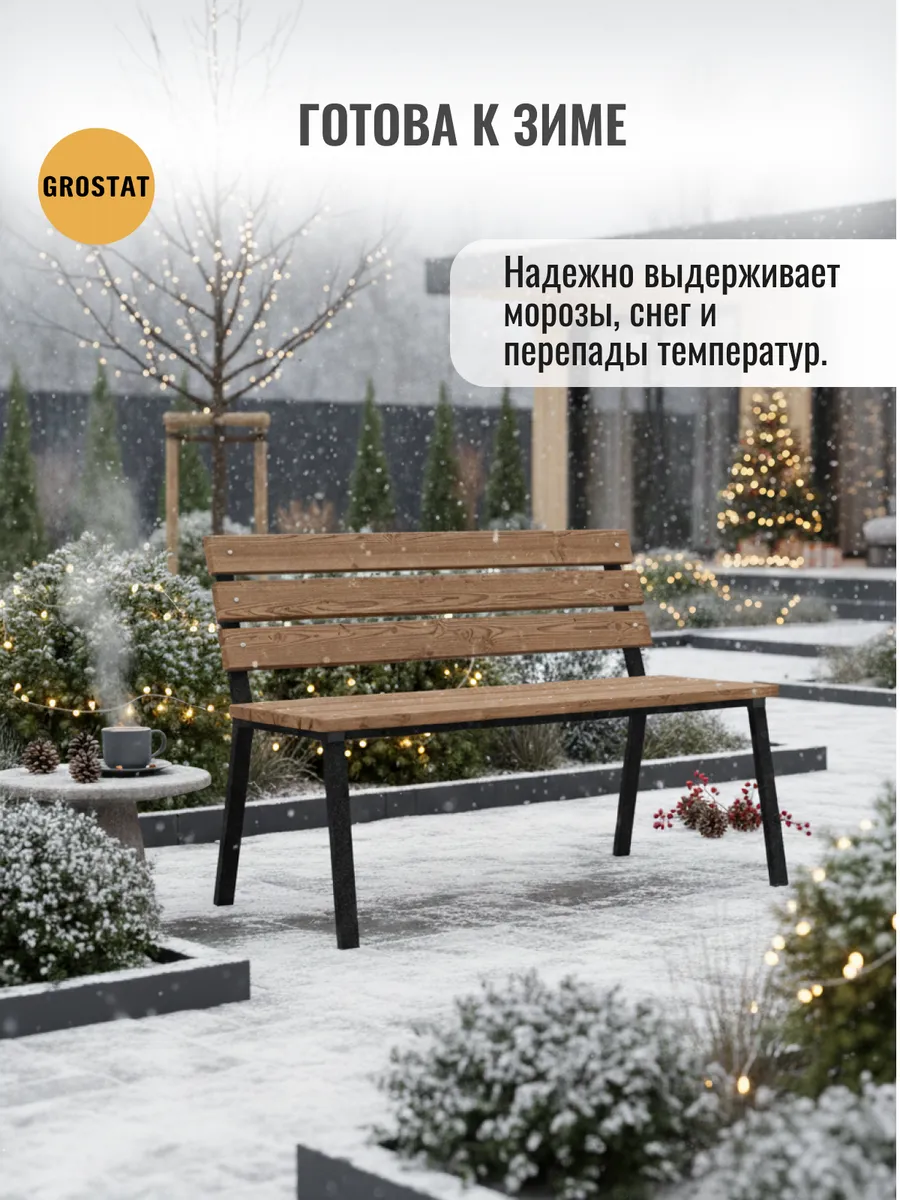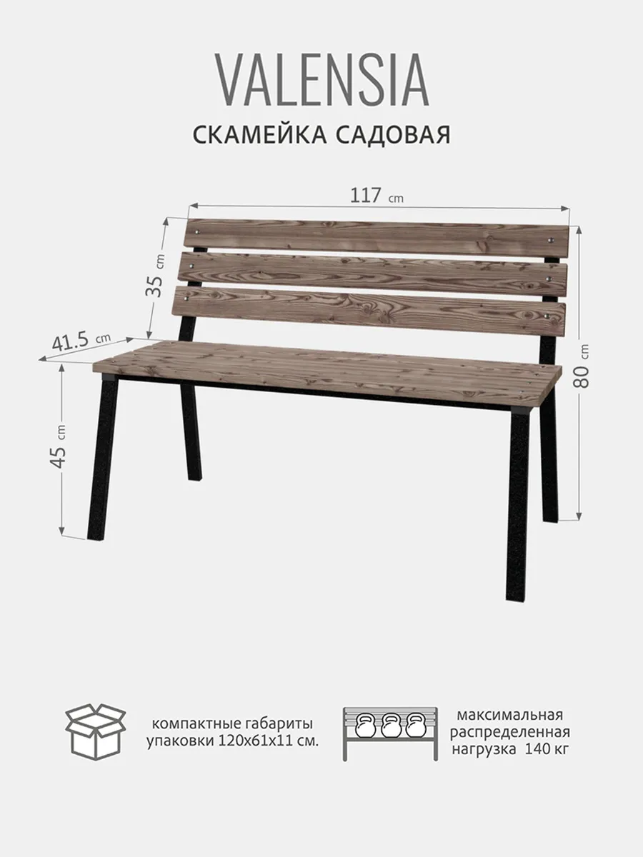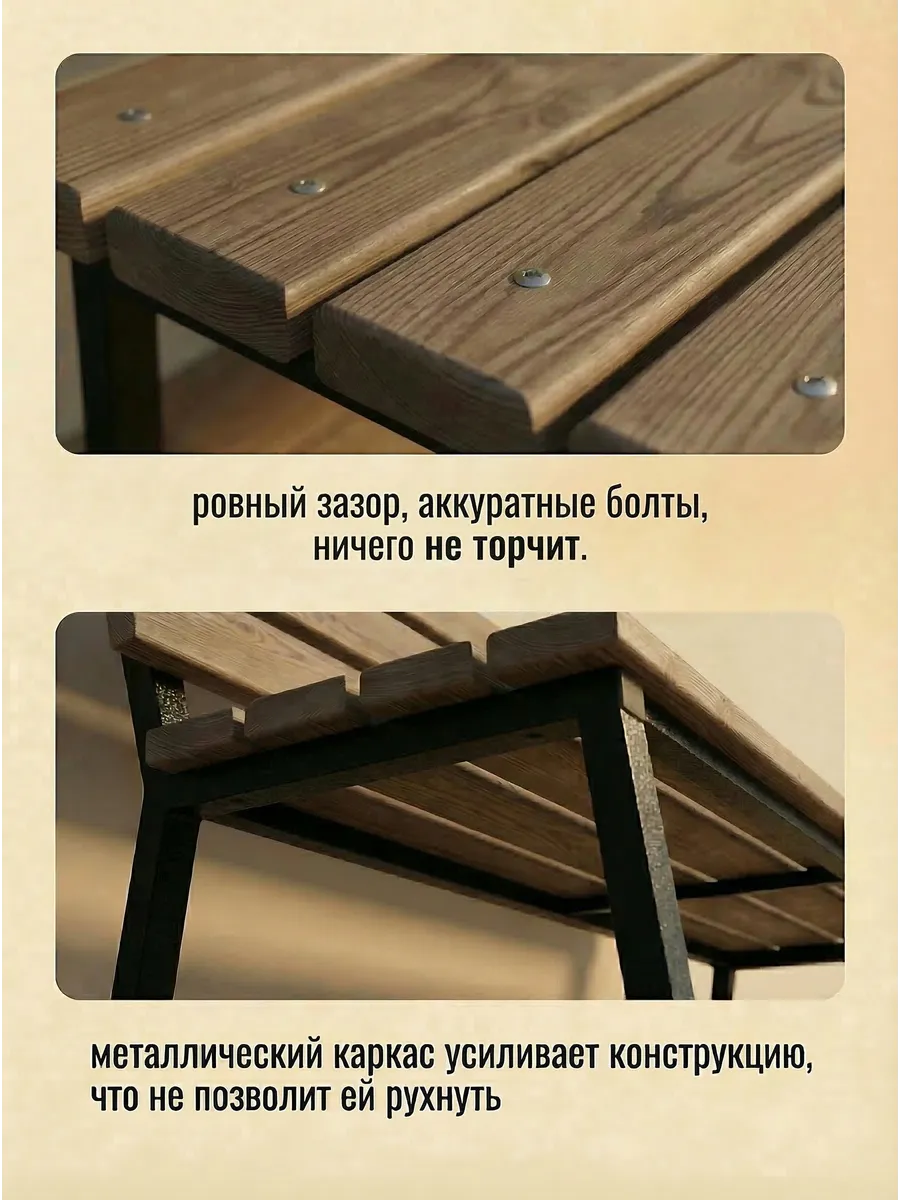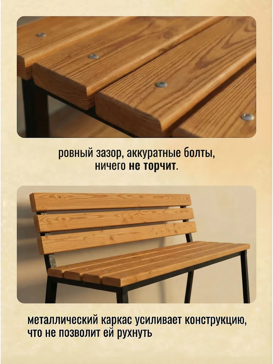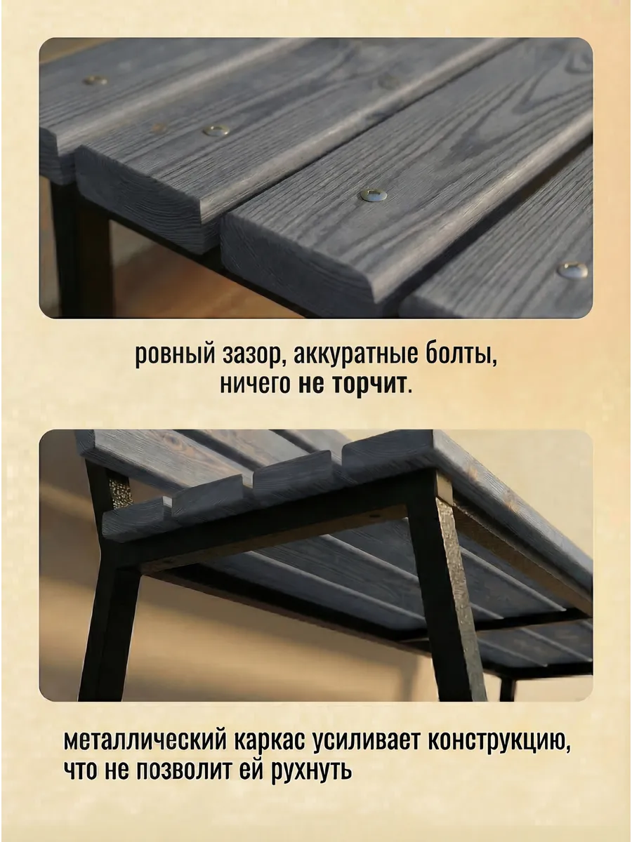 Устойчивая к любым погодным условиям. Дерево обработано в 2 слоя маслом финского производства специальная для уличной мебели с элементами воска, которая защищает от влаги, плесени, ультрафиолета. Каркас изготовлен из прочной стали окрашен в стойкую порошковую краску черного матового цвета, 2 крайние опоры соединены между собой металлической траверсой для надежности. Конструкция полностью разборная.