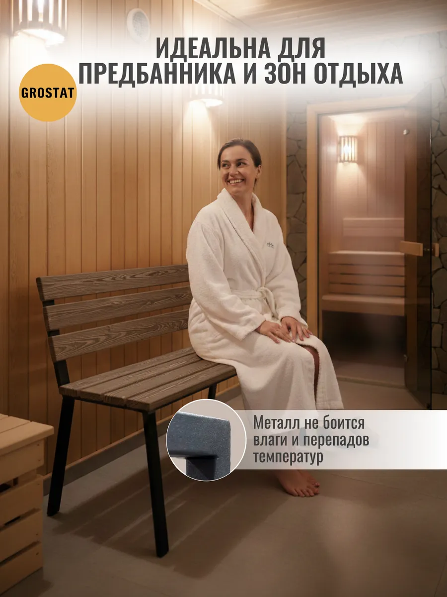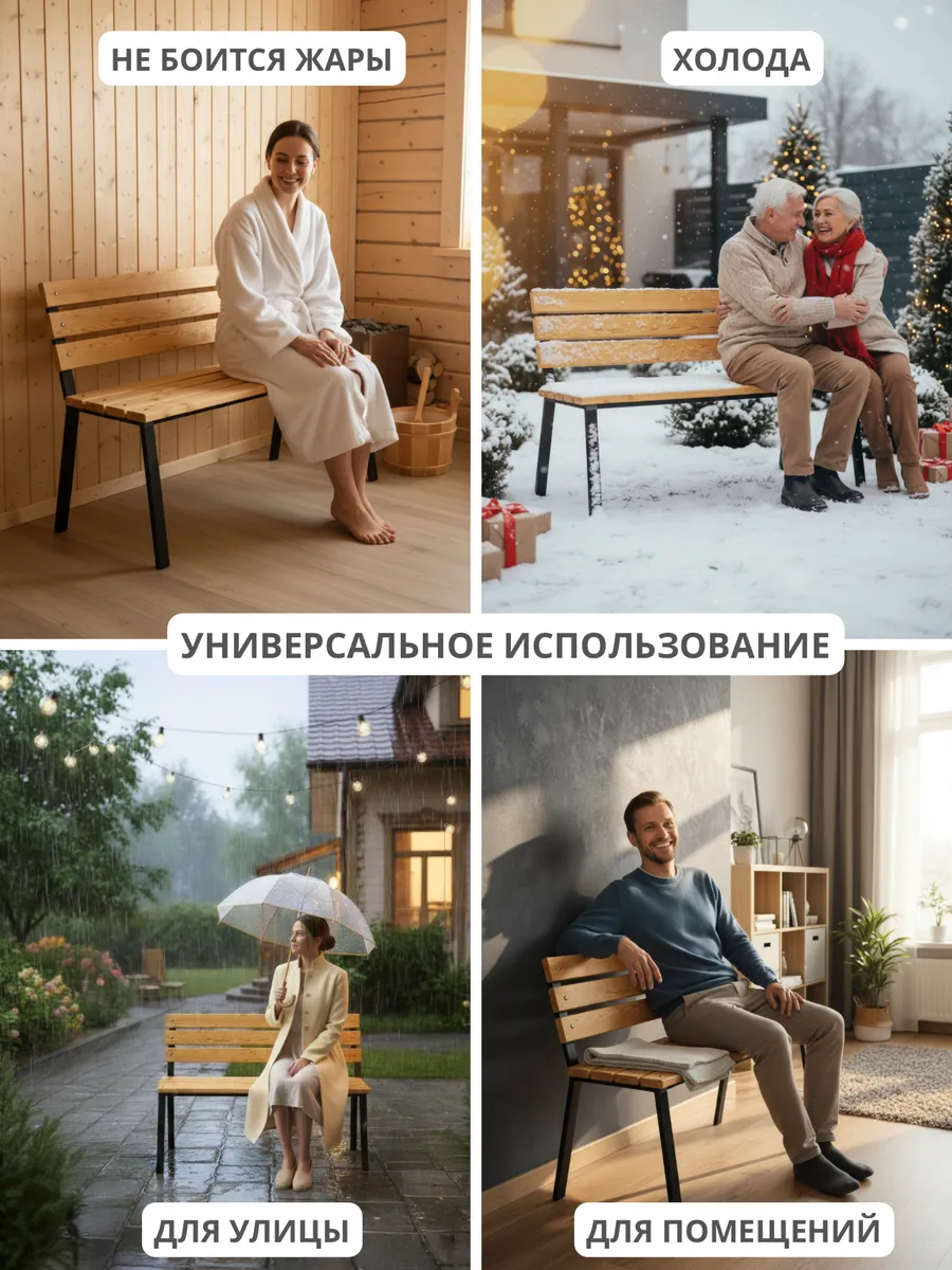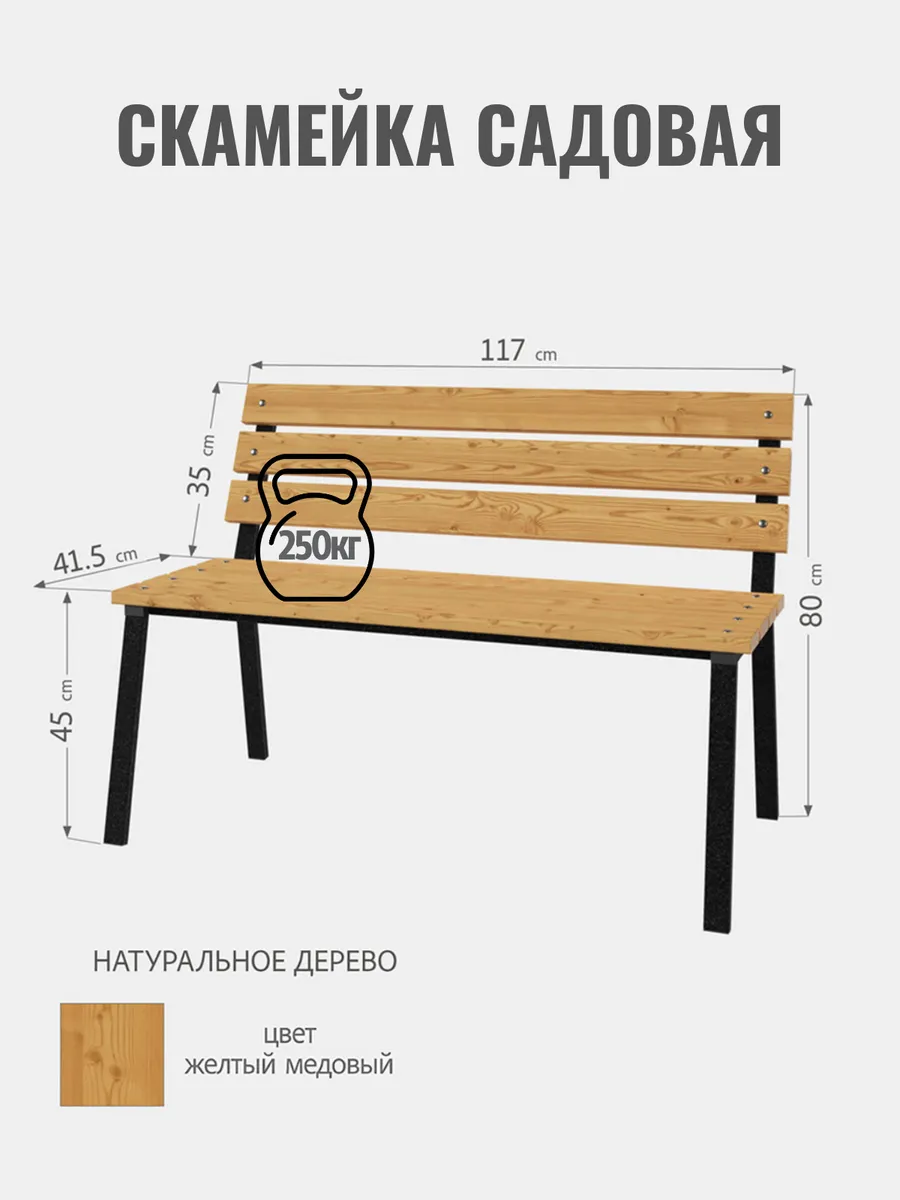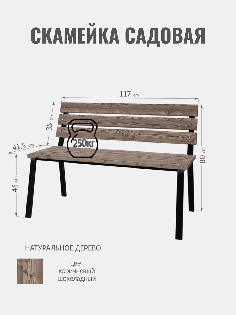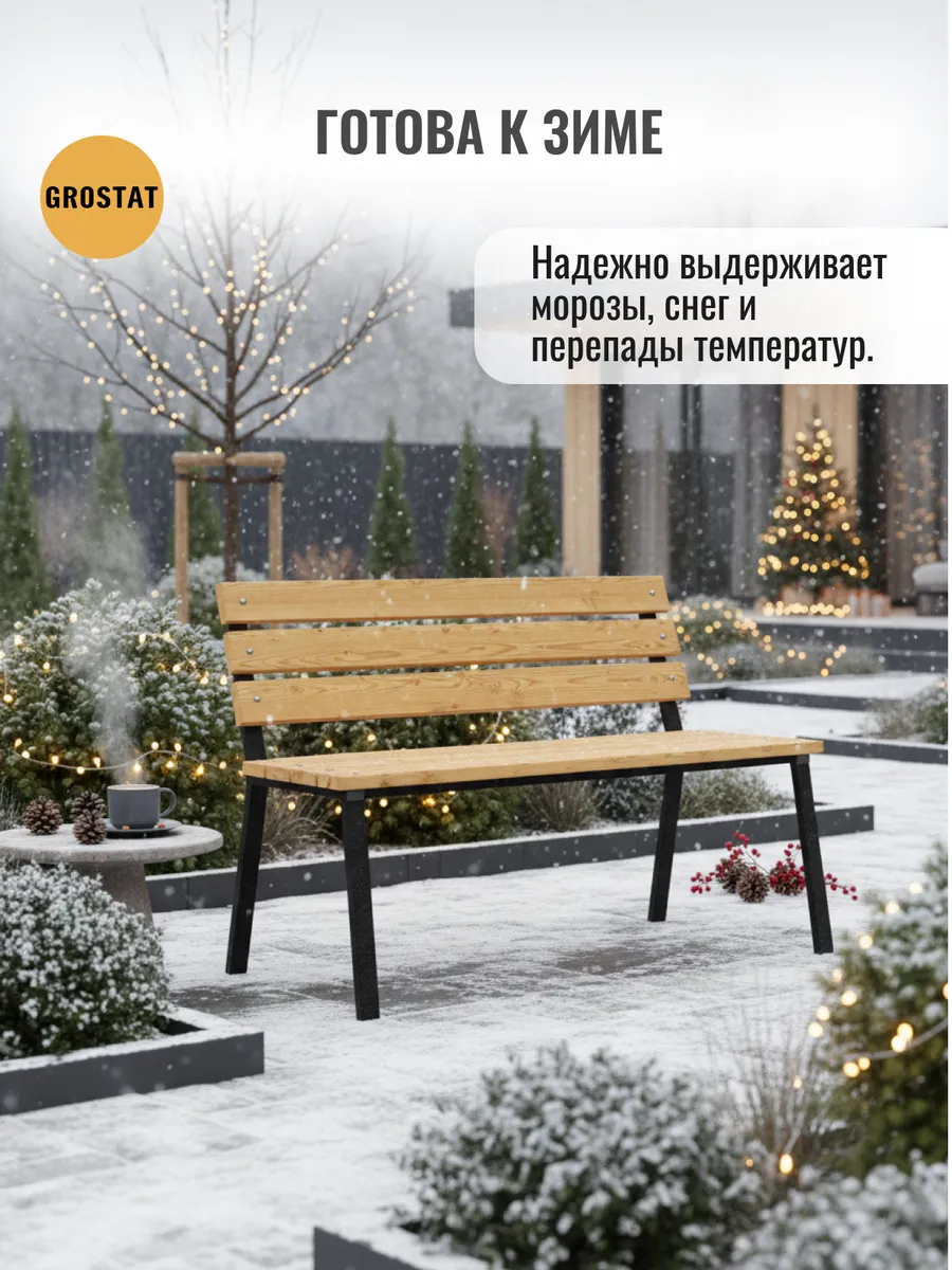 Устойчивая к любым погодным условиям. Дерево обработано в 2 слоя маслом финского производства специальная для уличной мебели с элементами воска, которая защищает от влаги, плесени, ультрафиолета. Каркас изготовлен из прочной стали окрашен в стойкую порошковую краску черного матового цвета, 2 крайние опоры соединены между собой металлической траверсой для надежности. Конструкция полностью разборная.