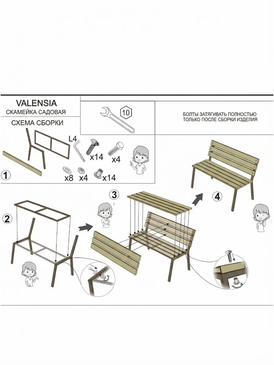 Поставляется скамейка садовая металлическая в разобранном виде в 1 упаковке, комплект крепежа входит. Легкая и быстрая сборка.