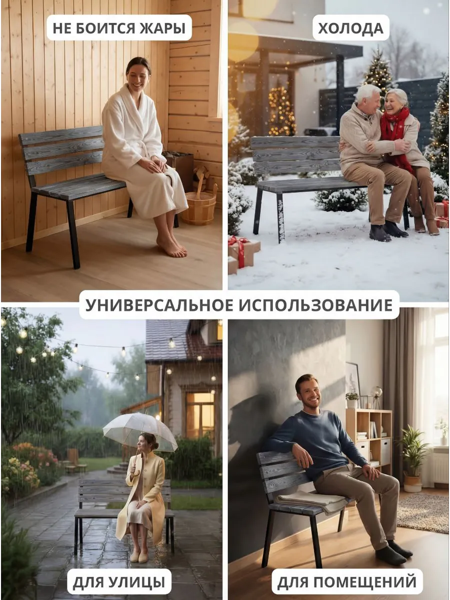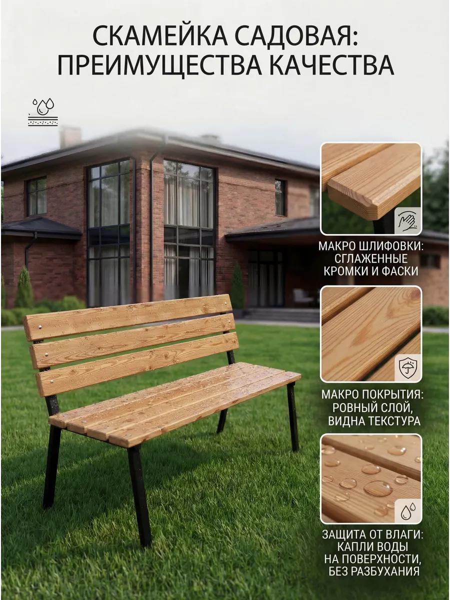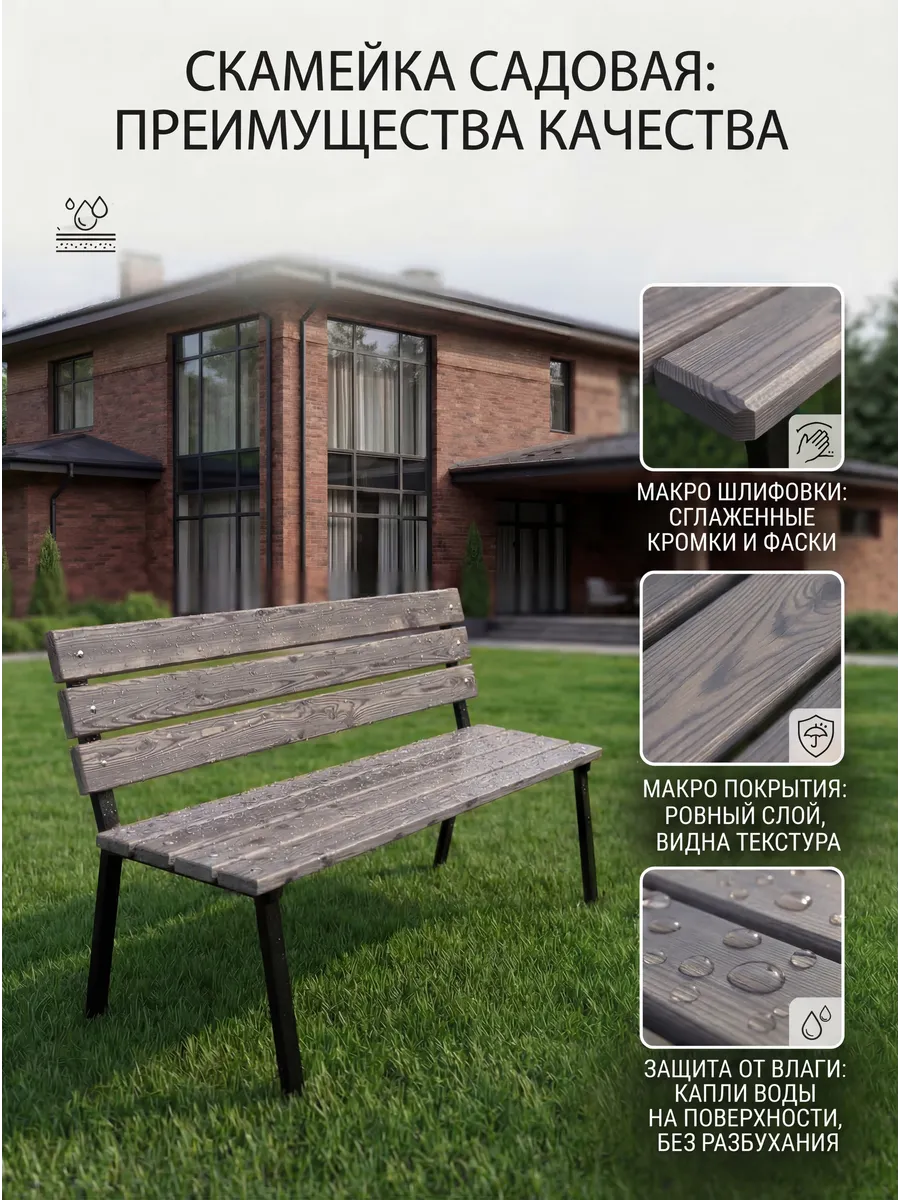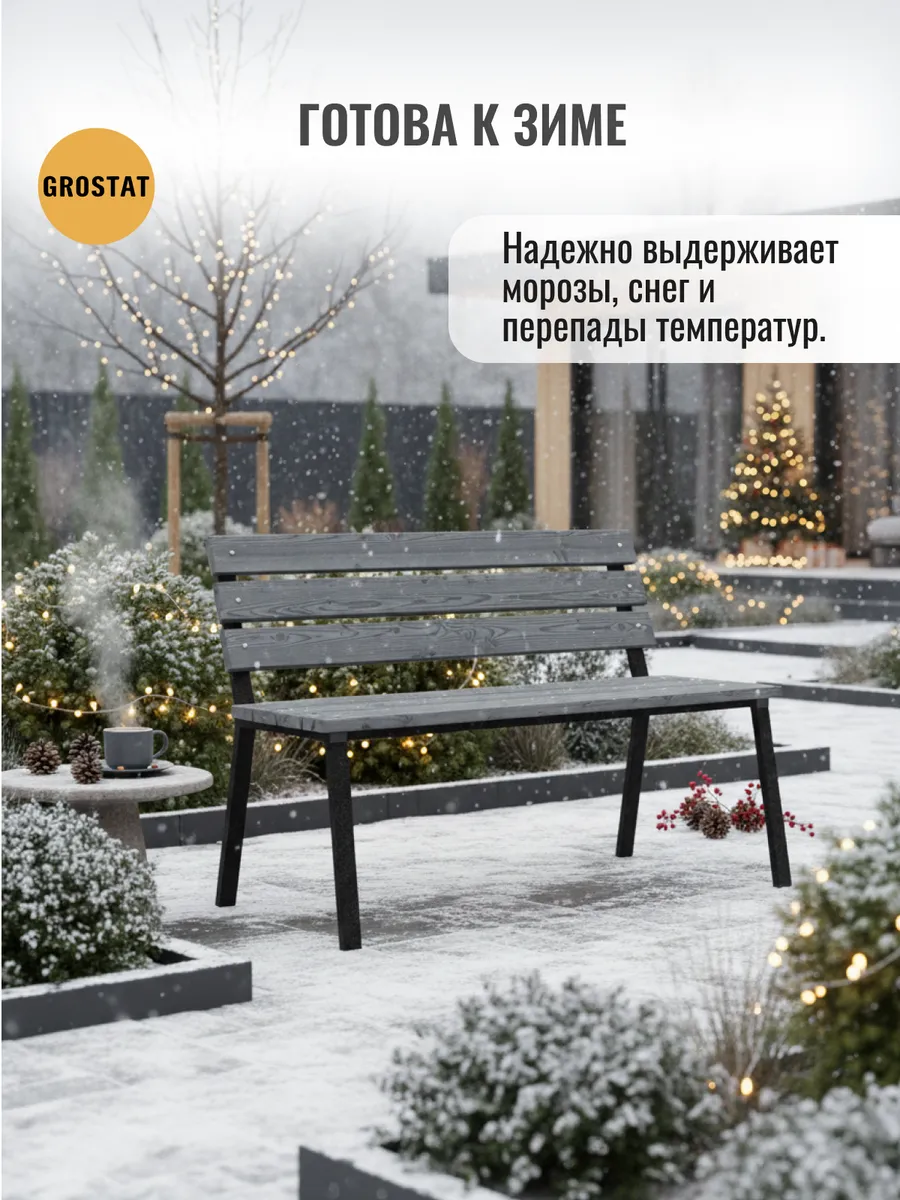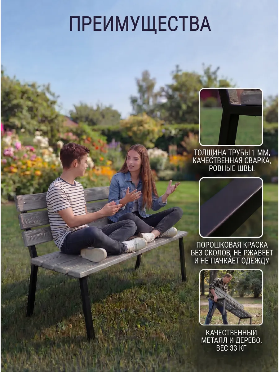 Используемые при производстве материалы обеспечивают надежность и долговечность конструкции, и дает возможность использовать скамью в любое время года.