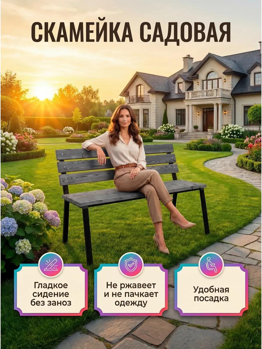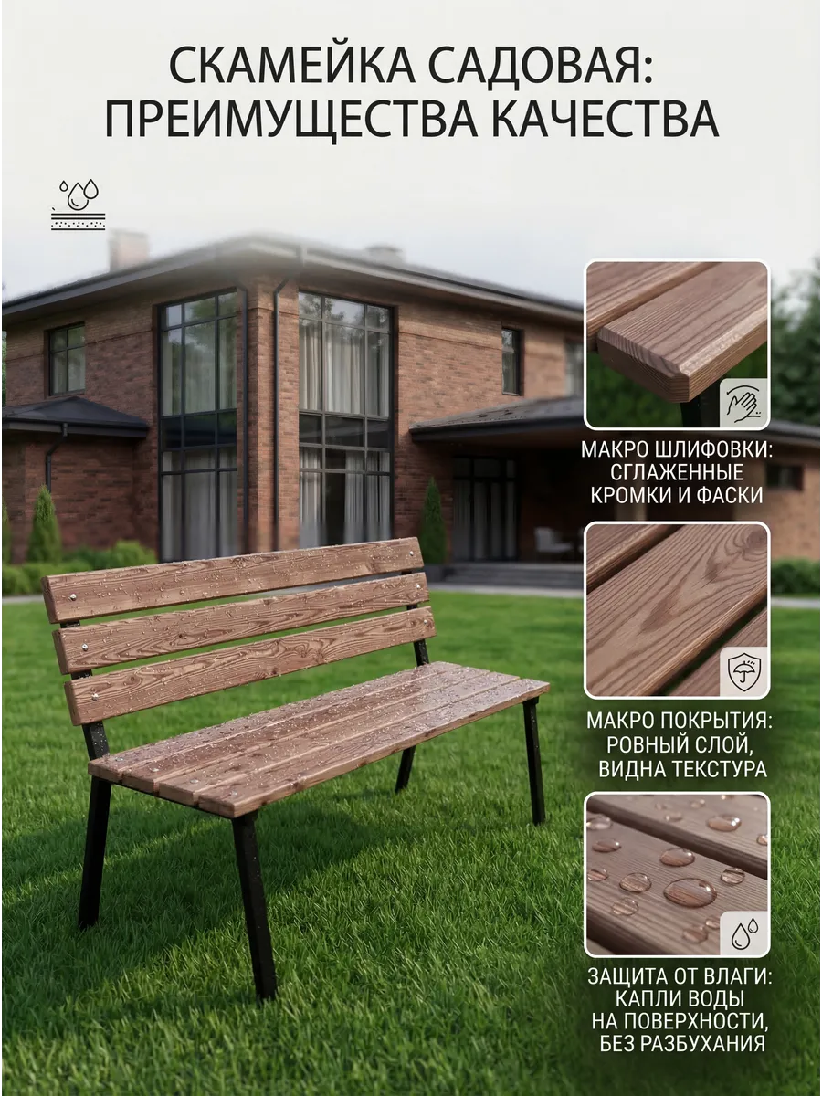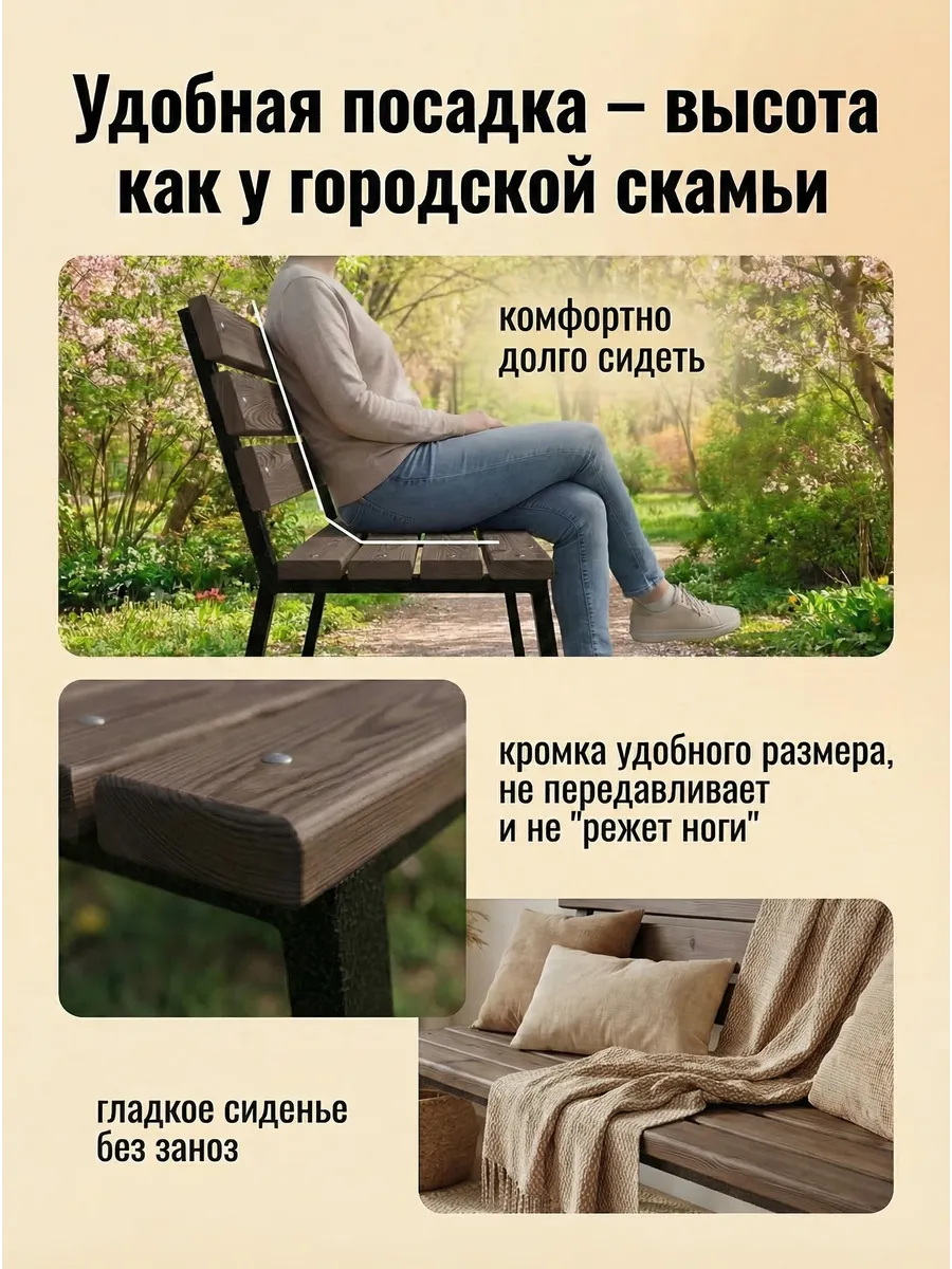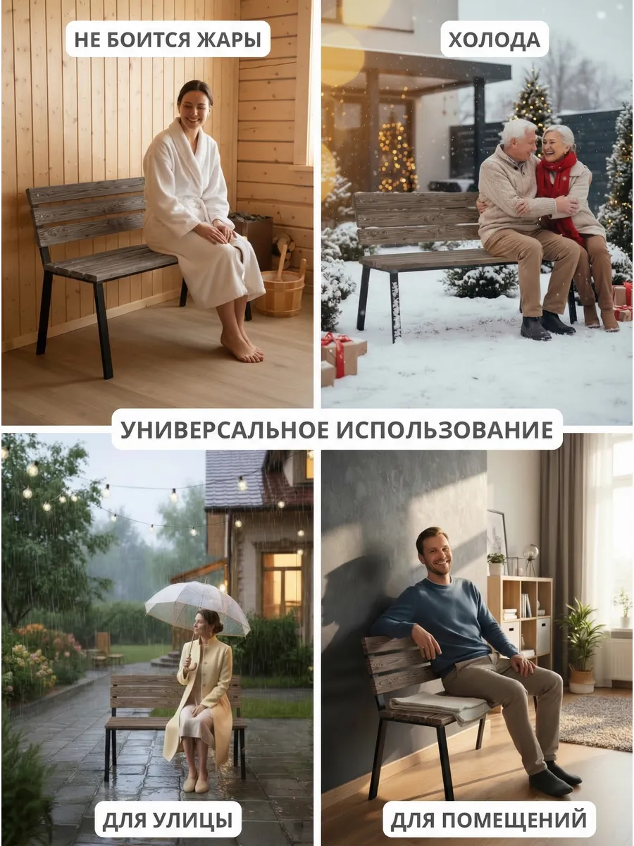 Используемые при производстве материалы обеспечивают надежность и долговечность конструкции, и дает возможность использовать скамью в любое время года.