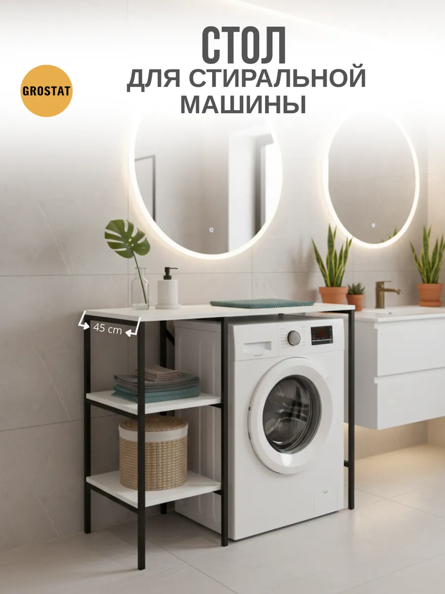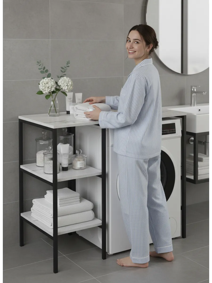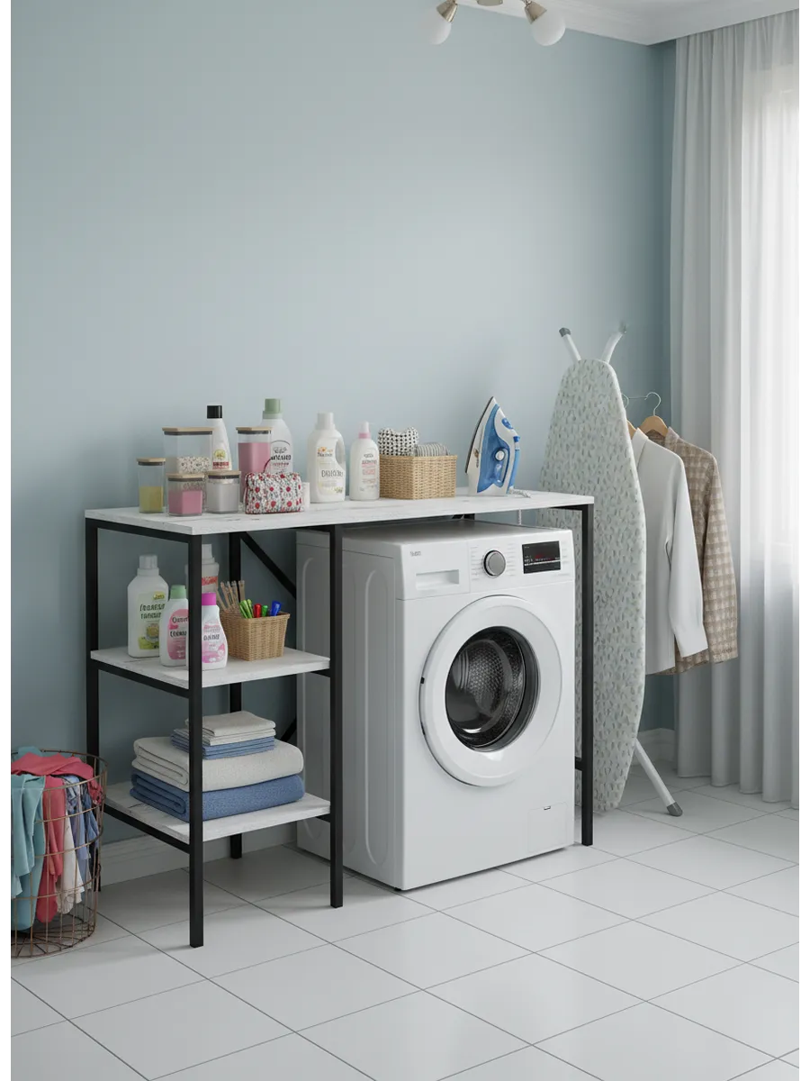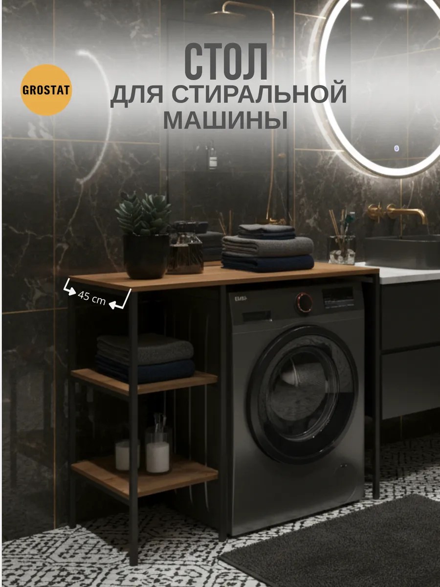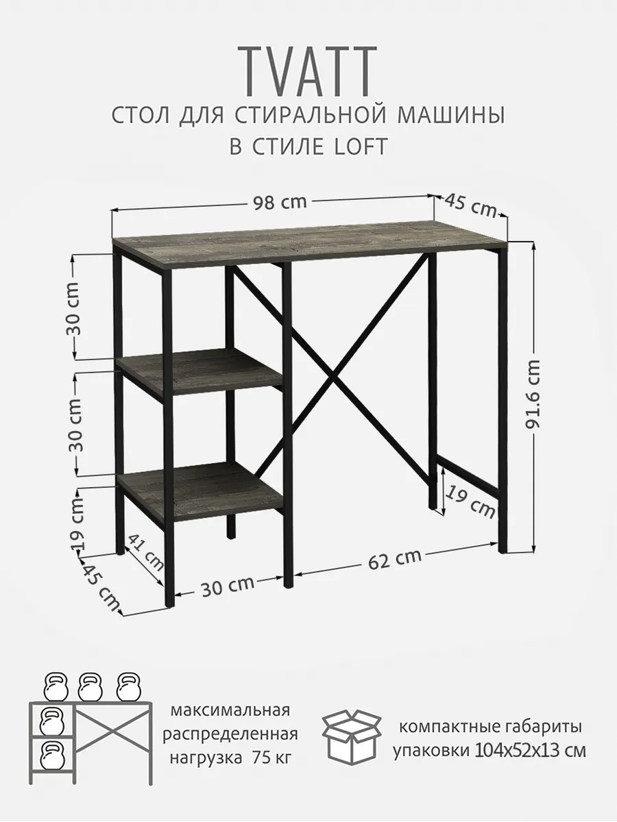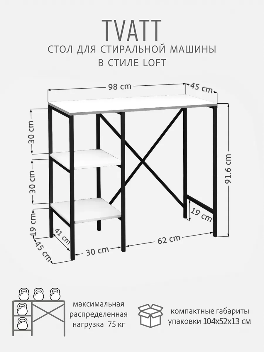 Универсальный стеллаж со столом TVATT loft для стиральной машины - настоящий органайзер для всех ваших вещей и аксессуаров. Стильный и компактный, он идеально впишется в любую ванную комнату, придавая ей порядок и уют. Достоинство данного стеллажа в ванную - удобное хранение в ванной различных предметов. Вы можете использовать его как тумбочку, на которой будут размещены косметика и принадлежности для ухода за собой. А благодаря высоким полкам на них смогут разместиться все вещи, необходимые для ежедневной жизни, декоративные корзинки, коллекция ароматических свечей, полотенец и даже есть место для массажной ванночки для ног или тазика. Полка над стиральной машиной станет идеальным местом для хранения необходимых предметов вашего быта. Используйте шкаф пенал, как полку для посуды, моющих средств или стойка для цветов, этот стеллаж органично впишется в интерьер вашей гостиной или кухни. Его модульный дизайн позволяет создавать оригинальные композиции из нескольких шкафчиков и полок нашего производства UNA LOFT и UNA LOFT mini. Прочная разборная конструкция и качественные материалы гарантируют надежность и долговечность этажерки. Каждая полка стеллажа может выдерживать нагрузку от 15 до 20 кг, что позволяет разместить на ней все необходимые предметы без беспокойства о прочности. Стол-стеллаж металлический оснащен регулируемыми опорами на ножках, которые обеспечивают устойчивость и защищают пол от царапин и вмятин. Вы можете легко подстроить его под любую поверхность для оптимального использования пространства.