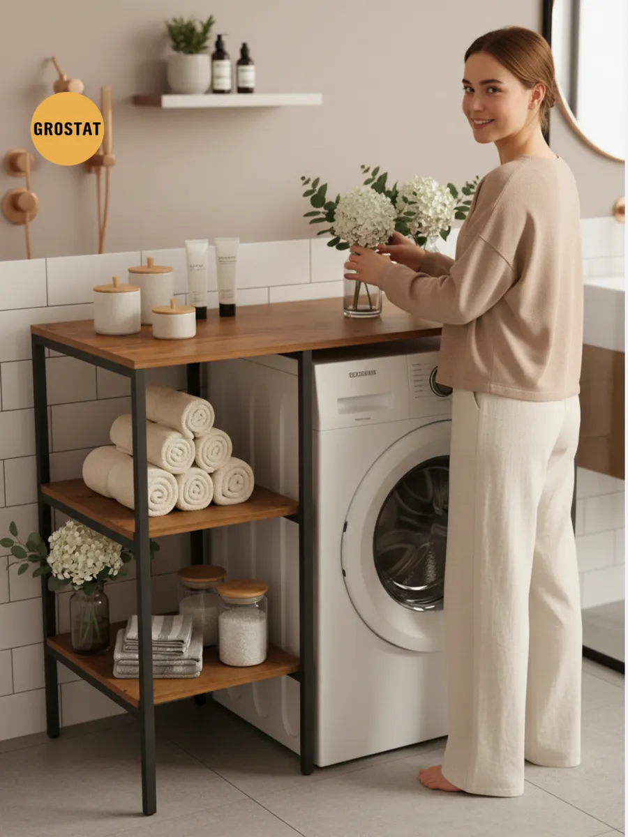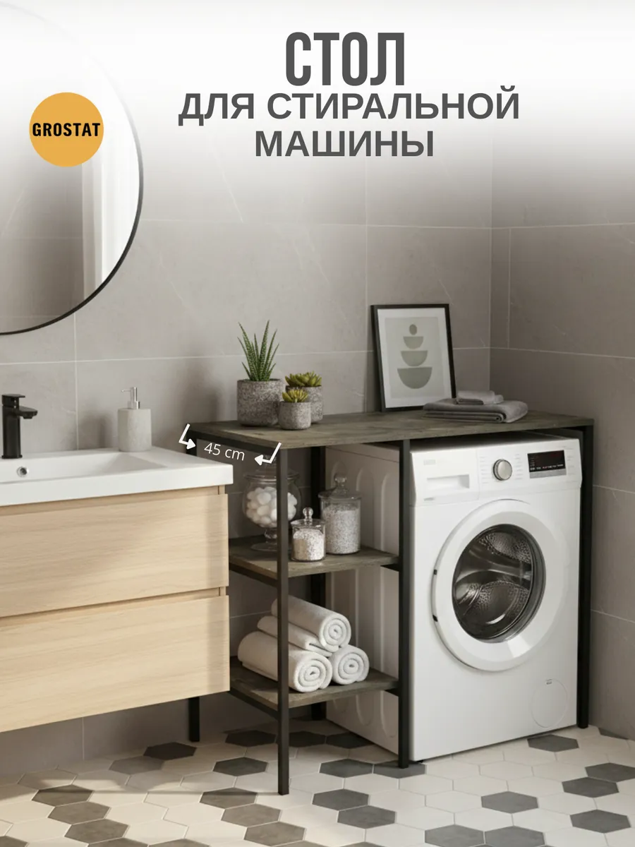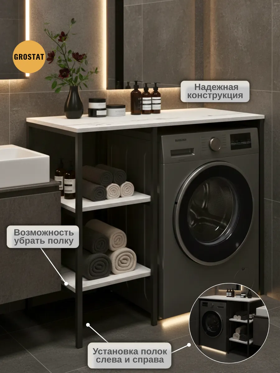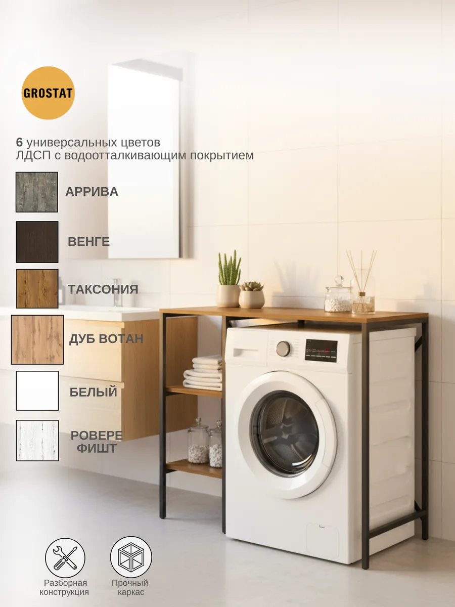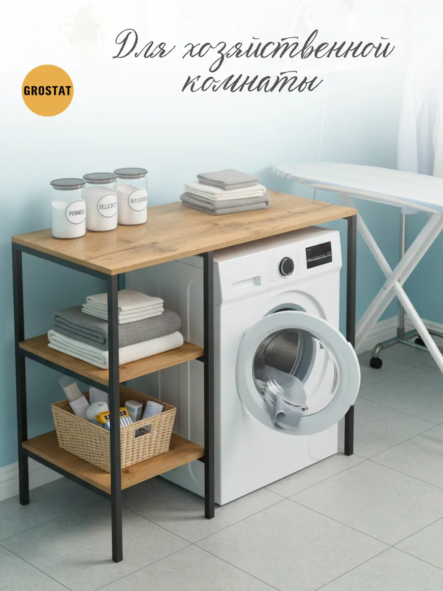Универсальный стеллаж со столом TVATT loft для стиральной машины - настоящий органайзер для всех ваших вещей и аксессуаров. Стильный и компактный, он идеально впишется в любую ванную комнату, придавая ей порядок и уют. Достоинство данного стеллажа в ванную - удобное хранение в ванной различных предметов. Вы можете использовать его как тумбочку, на которой будут размещены косметика и принадлежности для ухода за собой. А благодаря высоким полкам на них смогут разместиться все вещи, необходимые для ежедневной жизни, декоративные корзинки, коллекция ароматических свечей, полотенец и даже есть место для массажной ванночки для ног или тазика. Полка над стиральной машиной станет идеальным местом для хранения необходимых предметов вашего быта. Используйте шкаф пенал, как полку для посуды, моющих средств или стойка для цветов, этот стеллаж органично впишется в интерьер вашей гостиной или кухни. Его модульный дизайн позволяет создавать оригинальные композиции из нескольких шкафчиков и полок нашего производства UNA LOFT и UNA LOFT mini. Прочная разборная конструкция и качественные материалы гарантируют надежность и долговечность этажерки. Каждая полка стеллажа может выдерживать нагрузку от 15 до 20 кг, что позволяет разместить на ней все необходимые предметы без беспокойства о прочности. Стол-стеллаж металлический оснащен регулируемыми опорами на ножках, которые обеспечивают устойчивость и защищают пол от царапин и вмятин. Вы можете легко подстроить его под любую поверхность для оптимального использования пространства.