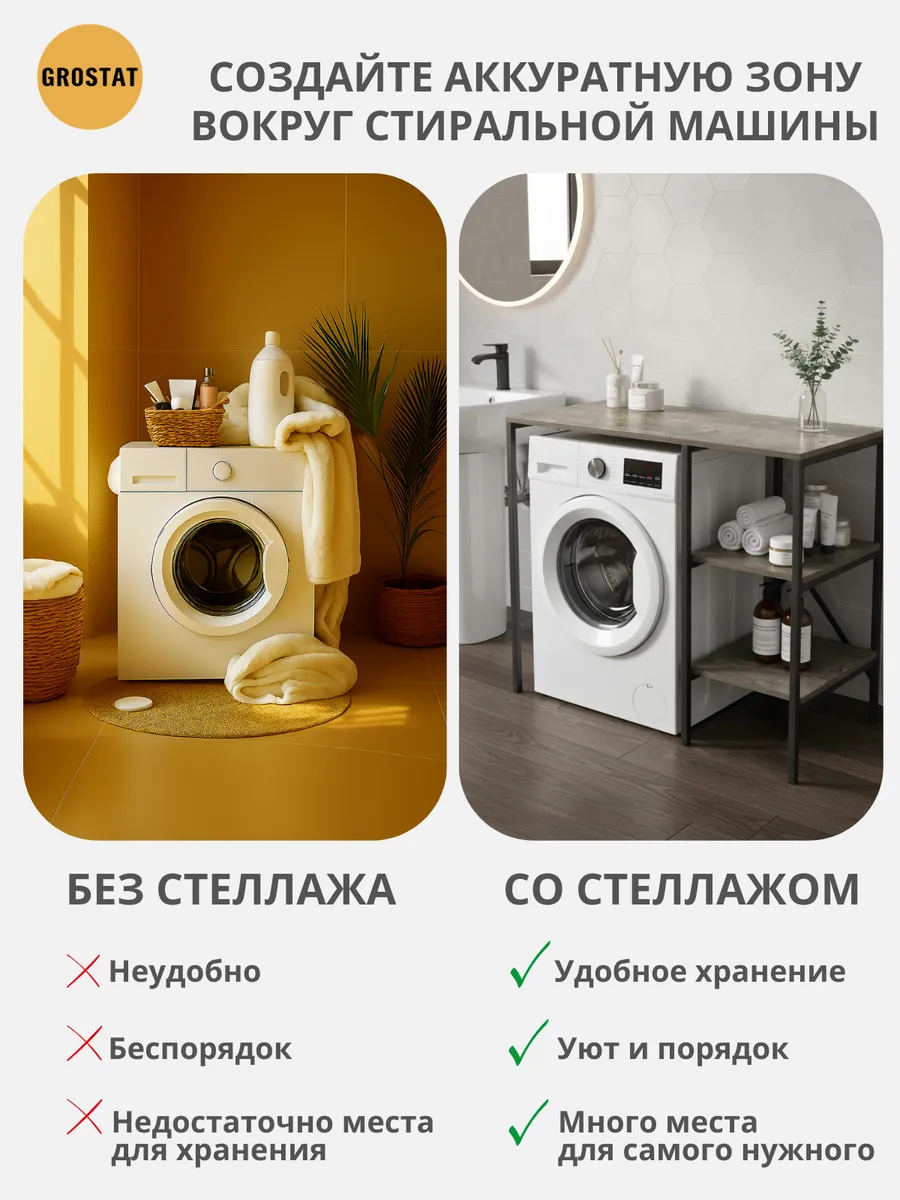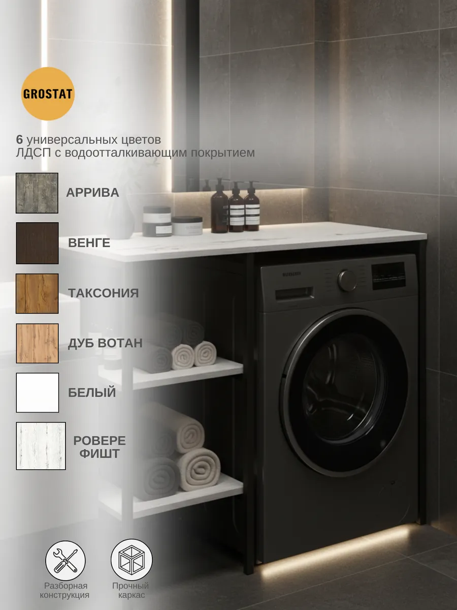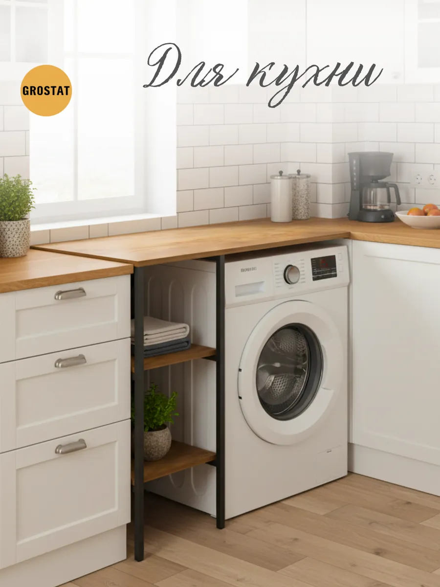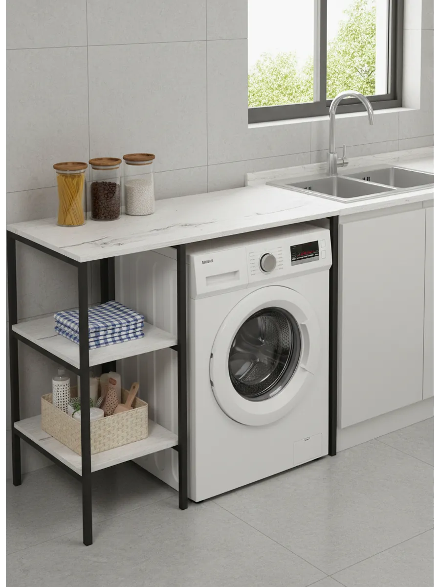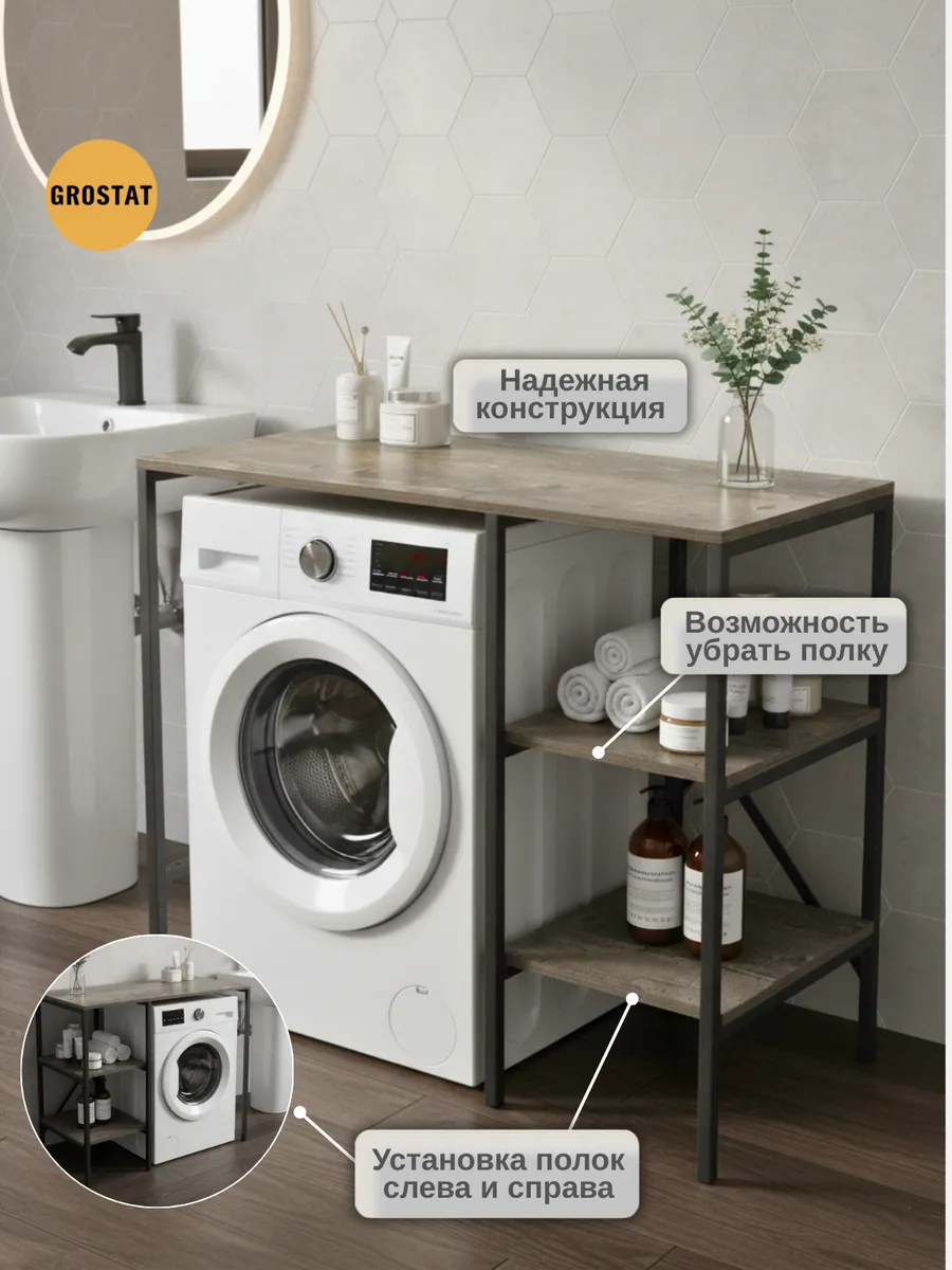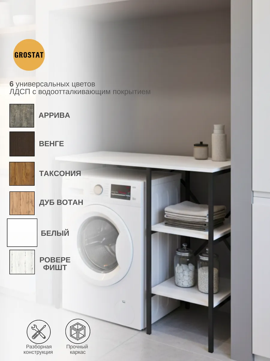 Универсальный стеллаж со столом TVATT loft для стиральной машины - настоящий органайзер для всех ваших вещей и аксессуаров. Стильный и компактный, он идеально впишется в любую ванную комнату, придавая ей порядок и уют. Достоинство данного стеллажа в ванную - удобное хранение в ванной различных предметов. Вы можете использовать его как тумбочку, на которой будут размещены косметика и принадлежности для ухода за собой. А благодаря высоким полкам на них смогут разместиться все вещи, необходимые для ежедневной жизни, декоративные корзинки, коллекция ароматических свечей, полотенец и даже есть место для массажной ванночки для ног или тазика. Полка над стиральной машиной станет идеальным местом для хранения необходимых предметов вашего быта. Используйте шкаф пенал, как полку для посуды, моющих средств или стойка для цветов, этот стеллаж органично впишется в интерьер вашей гостиной или кухни. Его модульный дизайн позволяет создавать оригинальные композиции из нескольких шкафчиков и полок нашего производства UNA LOFT и UNA LOFT mini. Прочная разборная конструкция и качественные материалы гарантируют надежность и долговечность этажерки. Каждая полка стеллажа может выдерживать нагрузку от 15 до 20 кг, что позволяет разместить на ней все необходимые предметы без беспокойства о прочности. Стол-стеллаж металлический оснащен регулируемыми опорами на ножках, которые обеспечивают устойчивость и защищают пол от царапин и вмятин. Вы можете легко подстроить его под любую поверхность для оптимального использования пространства.