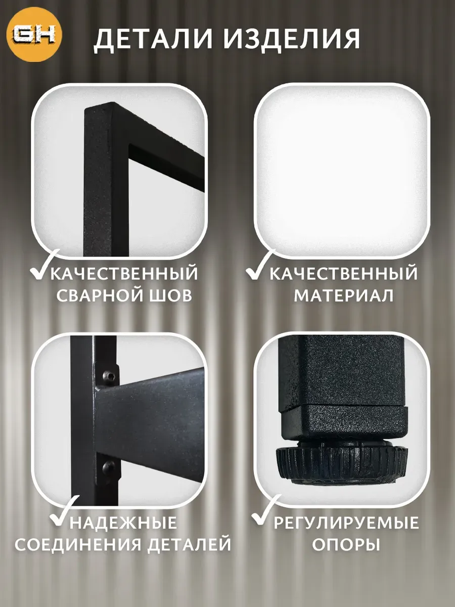 Металлический каркас у органайзера с полками выполнен из профиля 20 х 20 мм, окрашен в черный матовый цвет и защищен от ржавчины и коррозии благодаря порошковому покрытию, устойчивому к влаге. Полки изготовлены из высококачественного ЛДСП толщиной 16 мм. Столешница изготовлена из высококачественного ЛДСП, специальное ламинированное покрытие делает ее ударопрочной и не царапающейся, а также защищает от влаги. Стеллаж модульный напольный изготовлен из цельносварного металлического каркаса, усилен двумя задними металлическими балками, что позволяет ему сохранять устойчивое положение.