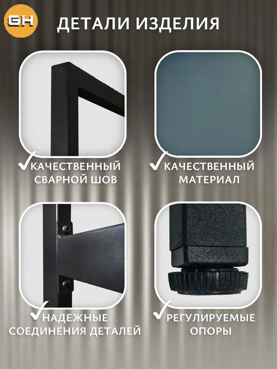 Металлический каркас у стеллажа с полками выполнен из квадратной профильной трубы 20х20мм, окрашен в черный матовый цвет и защищен от ржавчины и коррозии благодаря порошковому покрытию, устойчивому к влаге. Полки изготовлены из высококачественного ЛДСП толщиной 16мм, каждая полочка выдерживает нагрузку до 20 кг. Стеллаж модульный изготовлен из цельносварного металлического каркаса, усилен двумя задними металлическими балками, что позволяет ему сохранять устойчивое положение. На ножках имеются регулируемые опоры, которые регулируются по высоте и позволяют защитить пол от царапин и вмятин.