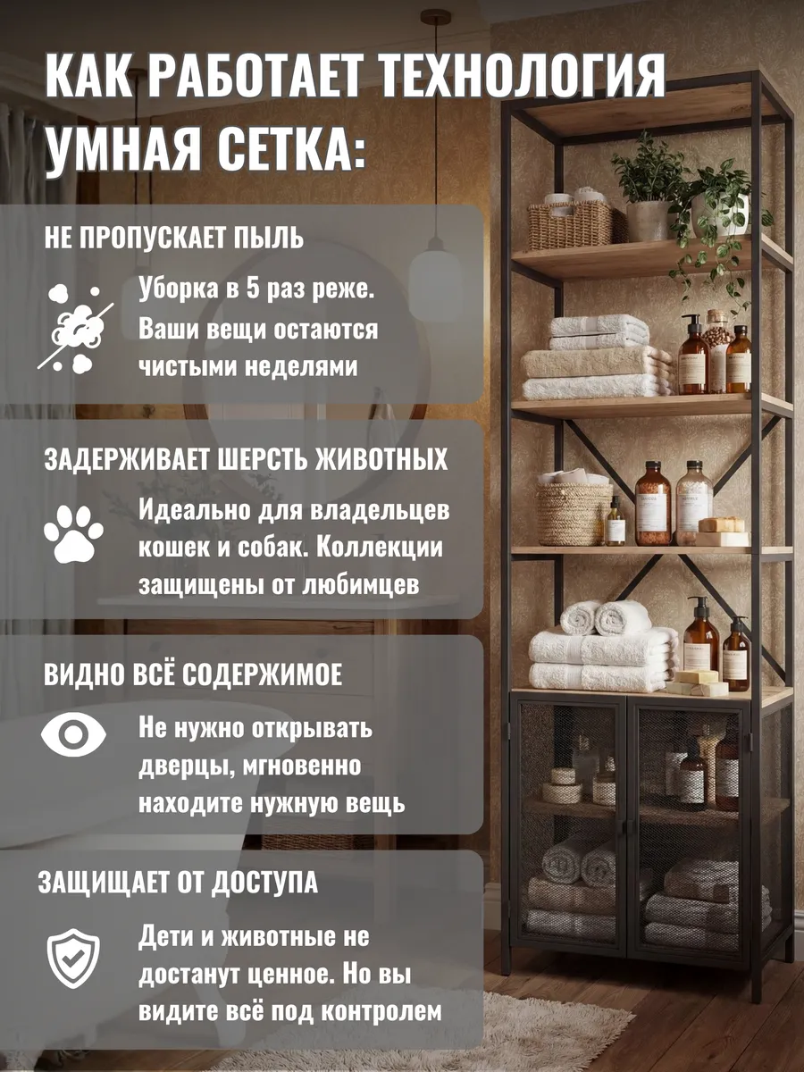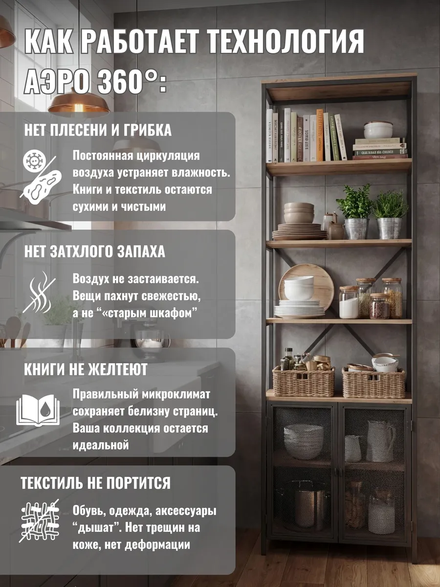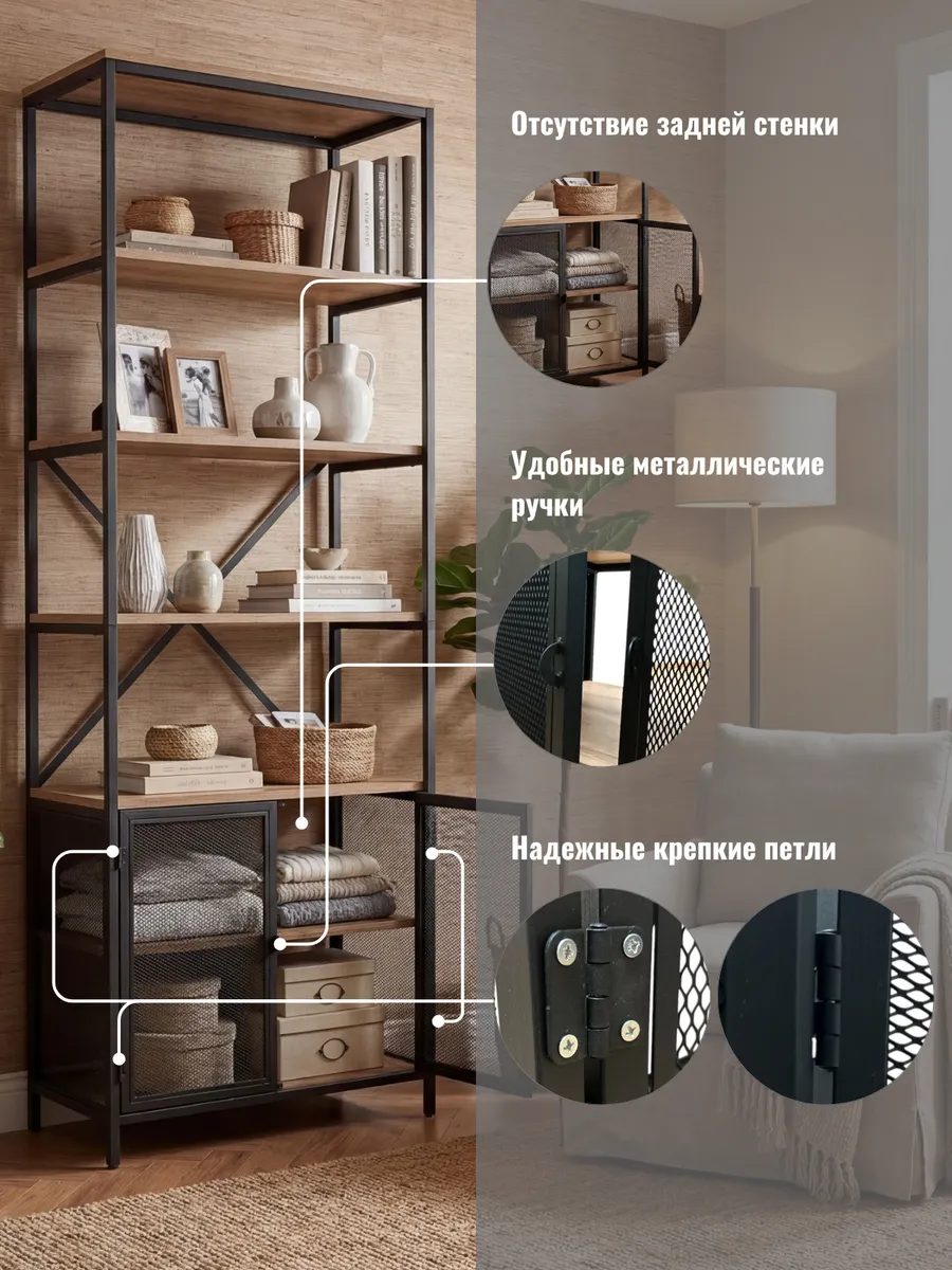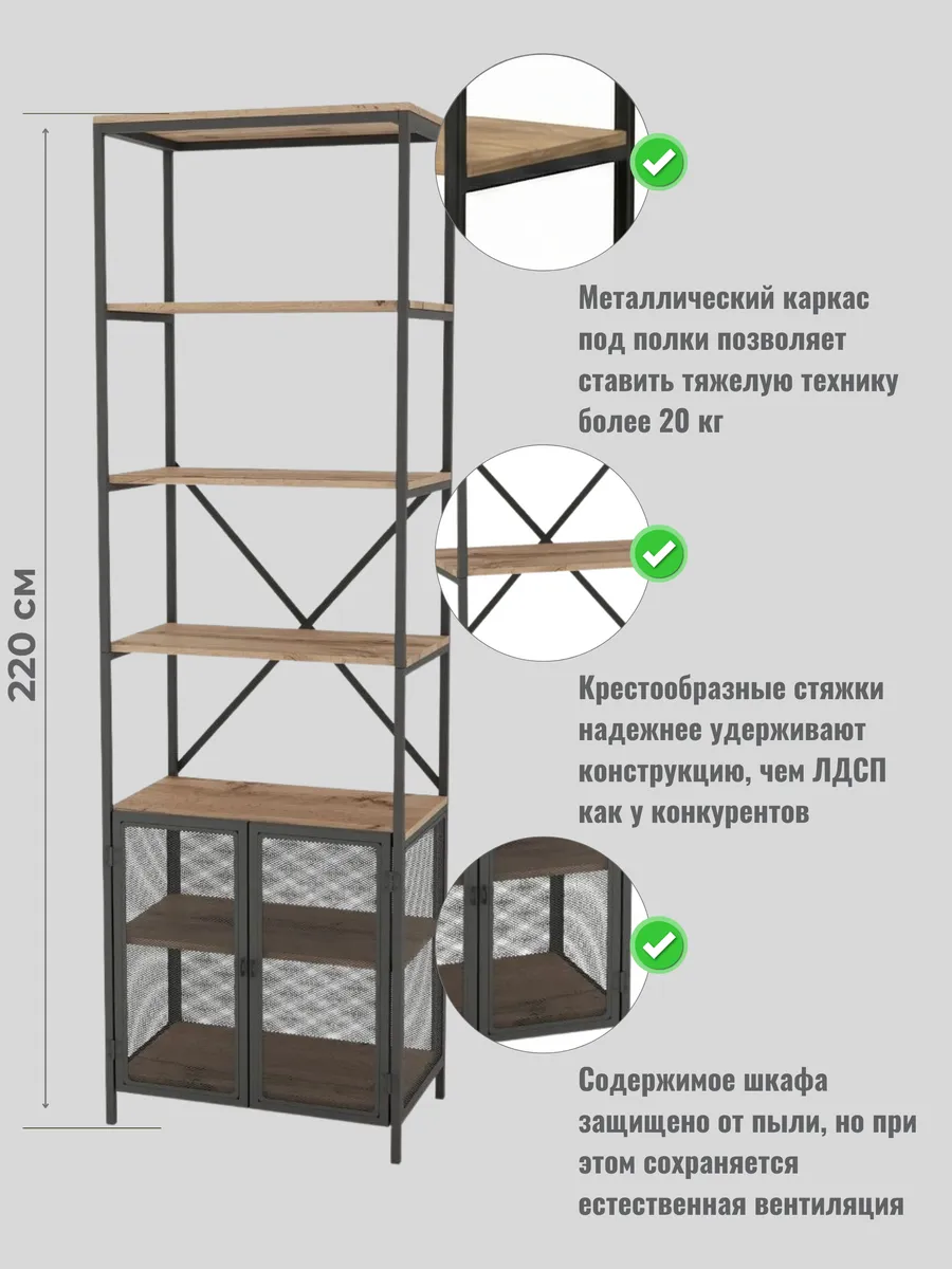 Особенностью конструкции являются удобные прорезные полки обеспечивающие быстрый доступ к содержимому и сетчатый отдел обеспечивающий циркуляцию воздуха. Надежная металлическая основа гарантирует долгий срок службы, а сдержанный дизайн органично дополняет популярный сегодня лофт-стиль.