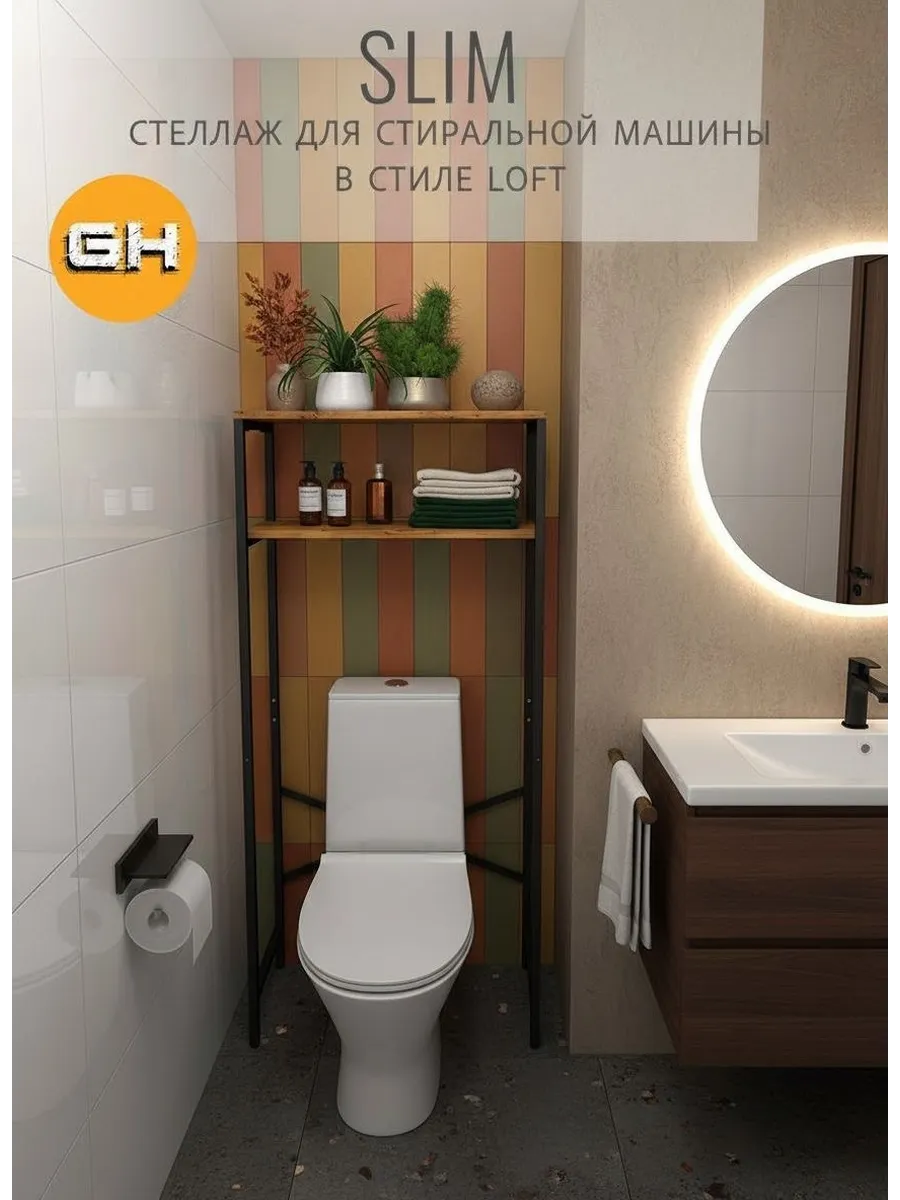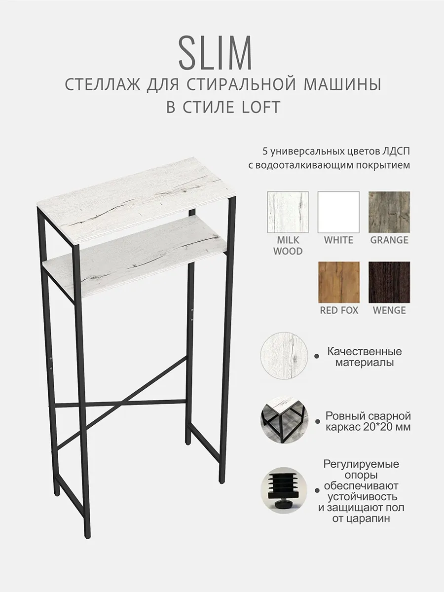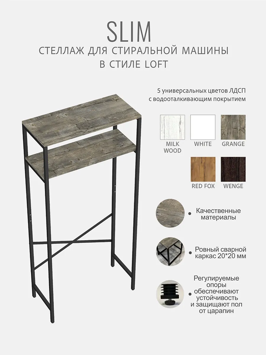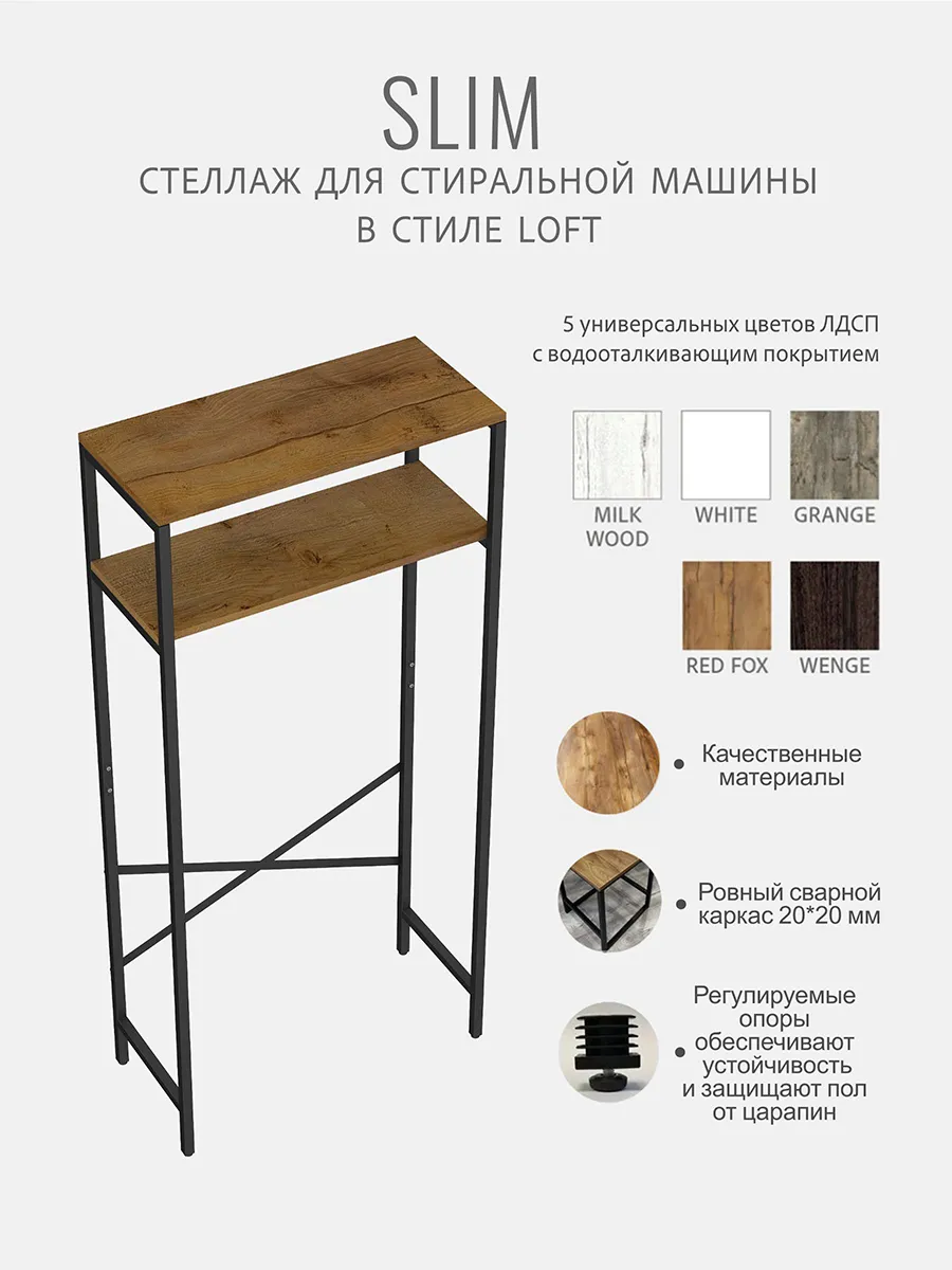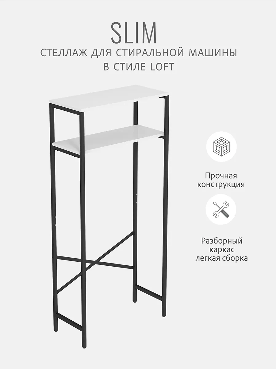 Стеллаж SLIM поможет организовать пространство над стиральной машиной или унитазом, обеспечивая дополнительную полезную площадь для размещения различных предметов и мелочей. Все, что ранее могло находиться в разных местах, удачно расставлено на этой самобытной полке. Таким образом, стеллаж над стиральной машиной или унитазом становится незаменимым помощником в поддержании порядка и организации ванной комнаты. Стеллаж для ванны и туалета поможет грамотно и удобно организовать хранение всех необходимых вещей для ванной и туалетной комнаты. Универсальная мебель для ванны, которая позволит вам разместить огромное количество нужной бытовой химии. На стеллаж в ванную можно поставить все многочисленные средства для чистки сантехники, раковин и плитки. Отлично заменяет шкаф в туалете за унитазом, освобождая огромное количество пространства вокруг. Стеллаж для ванной комнаты отлично подойдёт для хранения полотенец, емкостей с мылом, туалетной бумаги. Многофункциональная мебель для ванной комнаты! Этажерка в ванную комнату имеет 2 прочные полки. Металлический каркас у органайзера с полками выполнен из профиля 20 х 20 мм, окрашен в черный матовый цвет и защищен от ржавчины и коррозии благодаря порошковому покрытию, устойчивому к влаге. Полки изготовлены из высококачественного ЛДСП толщиной 16 мм. Столешница изготовлена из высококачественного ЛДСП, специальное ламинированное покрытие делает ее ударопрочной и не царапающейся, а также защищает от влаги. Стеллаж модульный напольный изготовлен из цельносварного металлического каркаса, усилен двумя задними металлическими балками, что позволяет ему сохранять устойчивое положение.