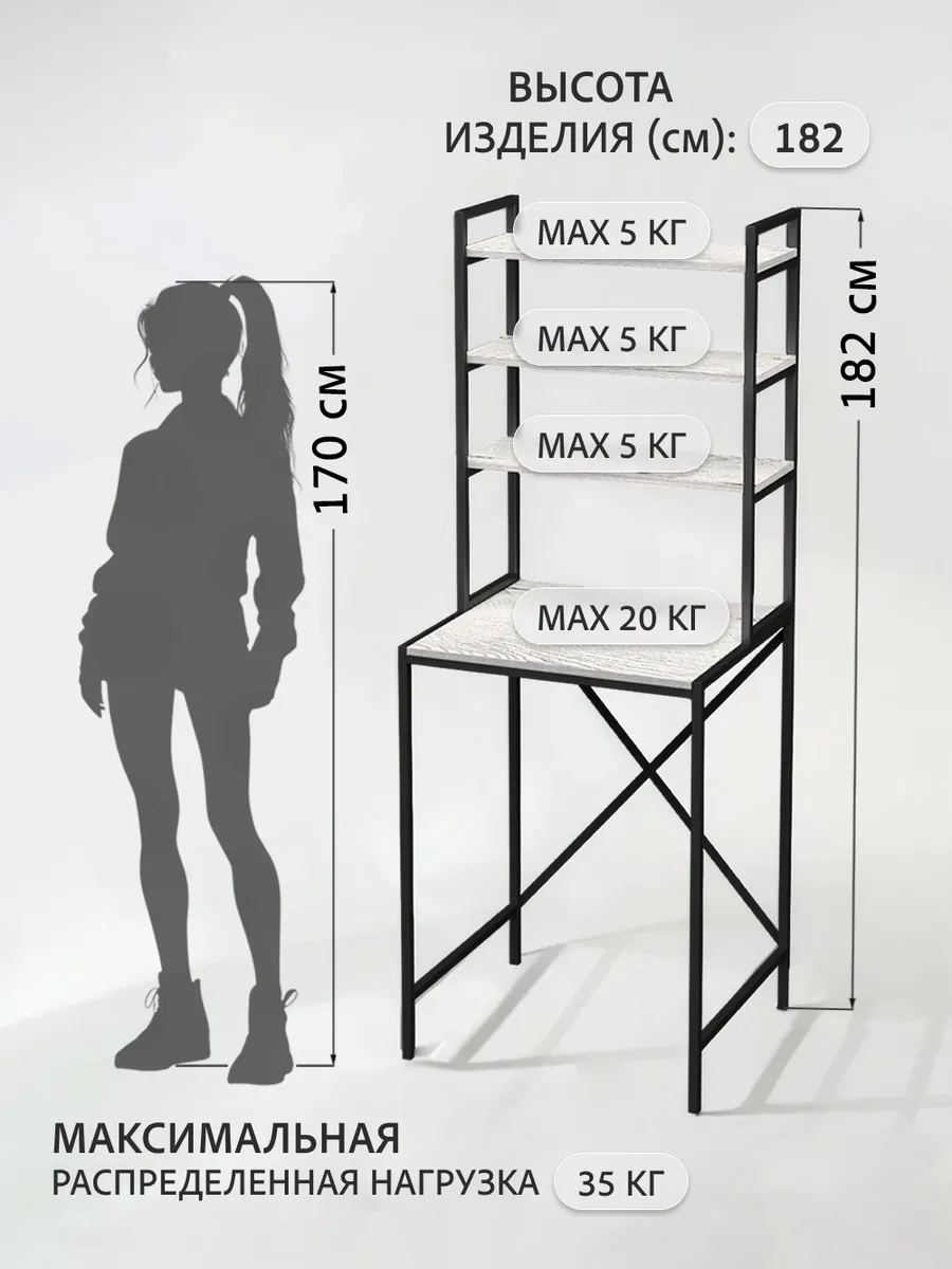 Прочная разборная конструкция и качественные материалы гарантируют надежность и долговечность этажерки. Каждая полка стеллажа может выдерживать нагрузку до 30 кг, что позволяет разместить на ней все необходимые предметы без беспокойства о прочности. Подобно незаменимому помощнику, он способен обеспечить аккуратную и эффективную систему хранения без излишеств. Высота полок позволяет разместить декоративные корзины для хранения вещей.
