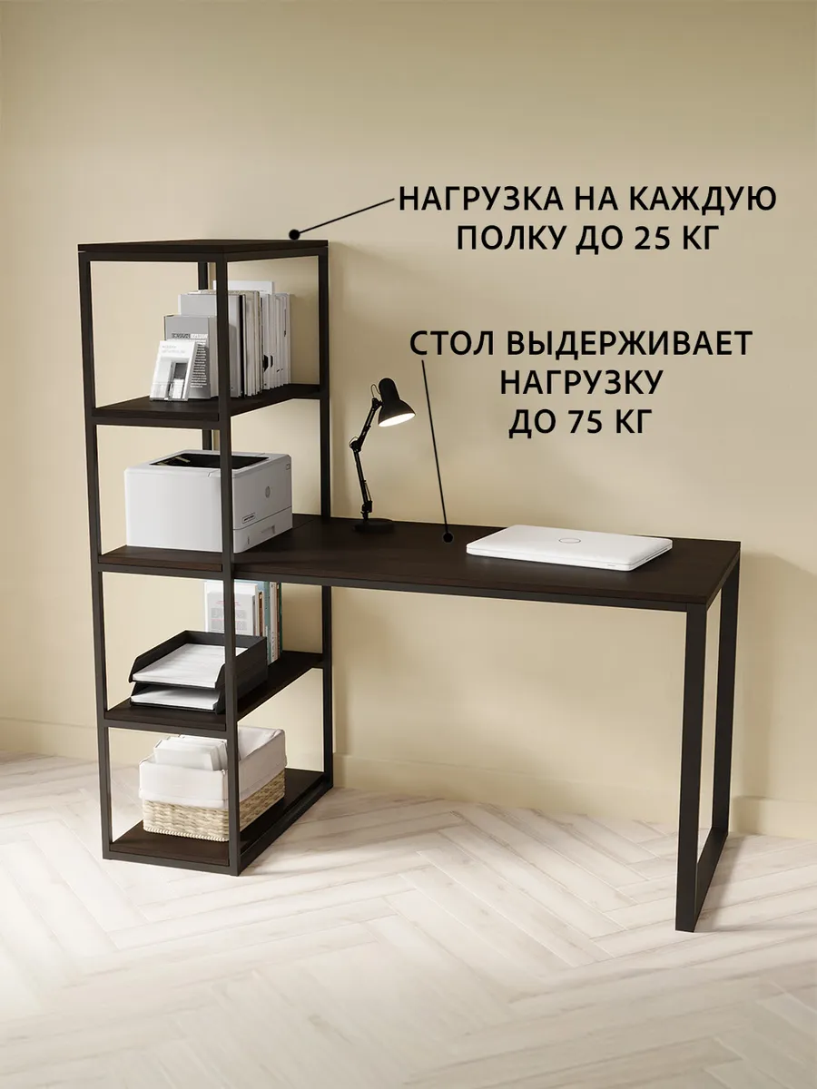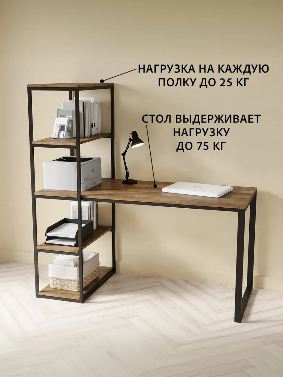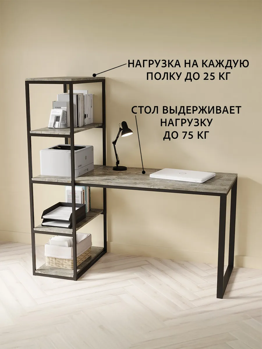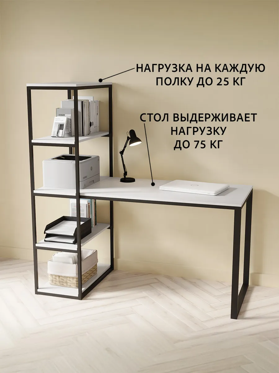 Металлическая конструкция выполнена из профильной трубы 40х20 мм и 20х20 мм, что позволяет выдерживать нагрузку 180 кг, стол так же усилен траверсой под самой столешницей для дополнительной устойчивости. Столешница изготовлена из высококачественного ЛДСП, специальное ламинированное покрытие делает ее ударопрочной и не царапающейся, а также защищает от влаги. На широкой столешнице можно свободно разместить ноутбук, настольную лампу, письменные принадлежности и другие предметы, необходимые для работы.
