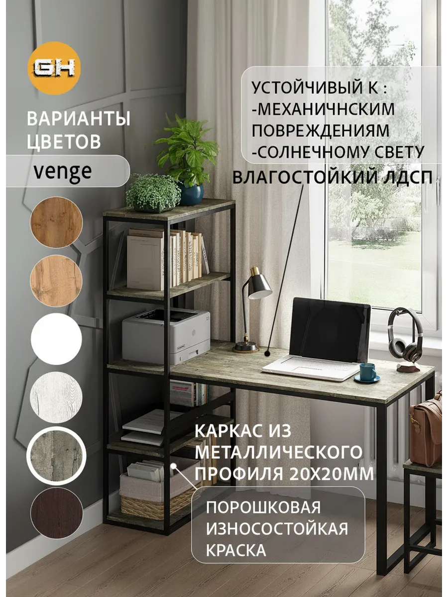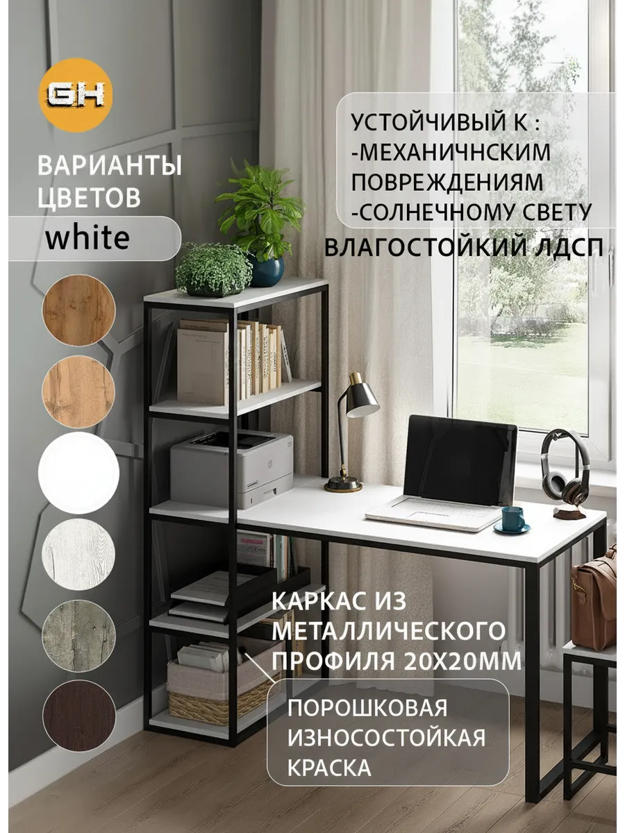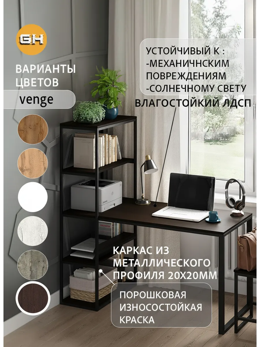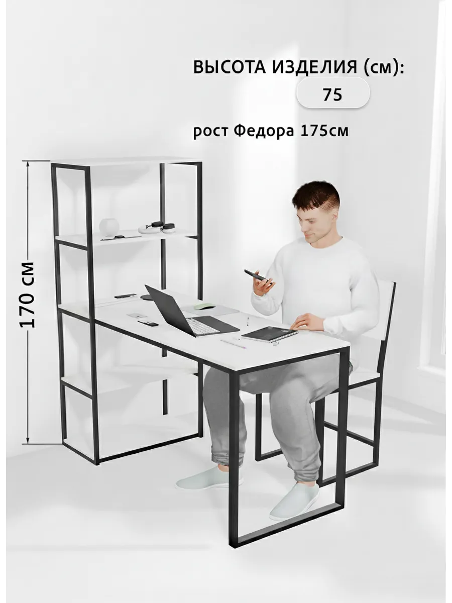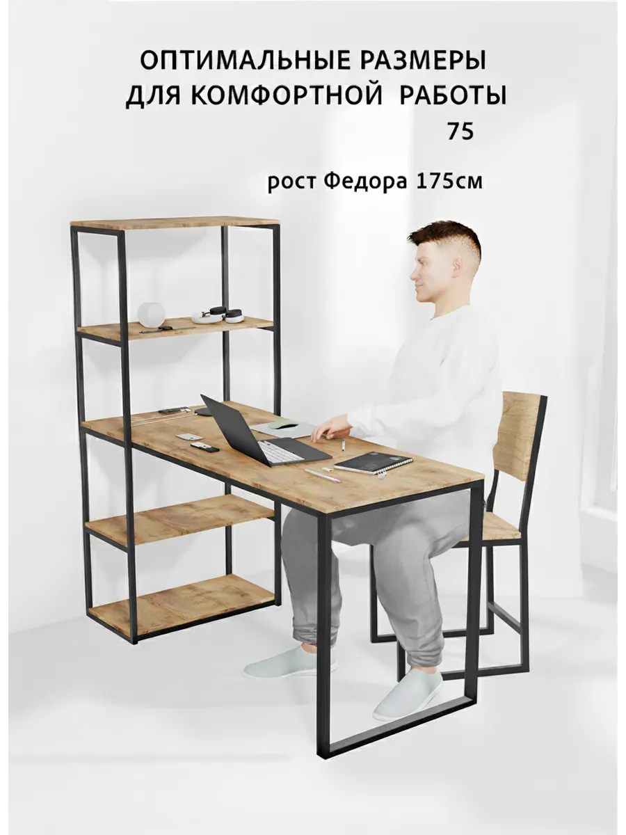 Металлическая конструкция выполнена из профильной трубы 40х20 мм и 20х20 мм, что позволяет выдерживать нагрузку 180 кг, стол так же усилен траверсой под самой столешницей для дополнительной устойчивости. Столешница изготовлена из высококачественного ЛДСП, специальное ламинированное покрытие делает ее ударопрочной и не царапающейся, а также защищает от влаги. На широкой столешнице можно свободно разместить ноутбук, настольную лампу, письменные принадлежности и другие предметы, необходимые для работы.