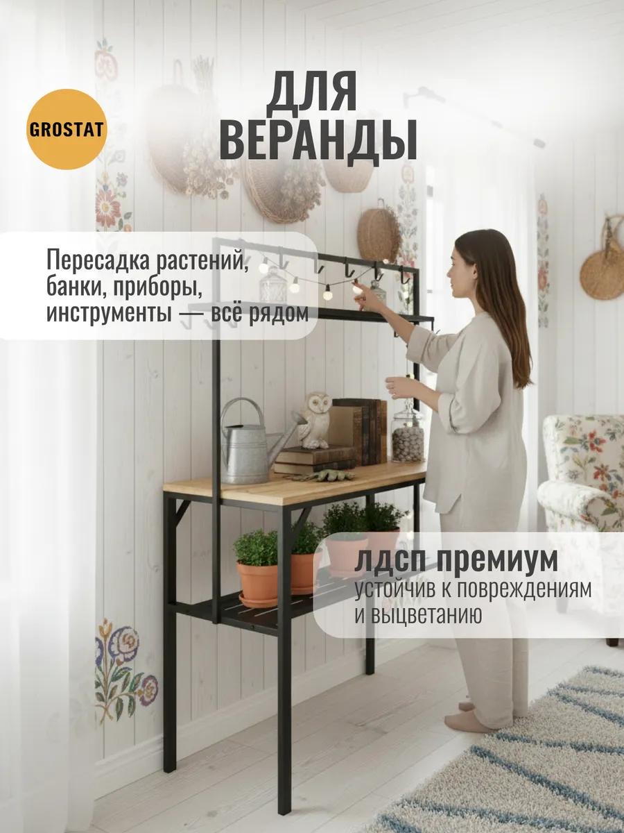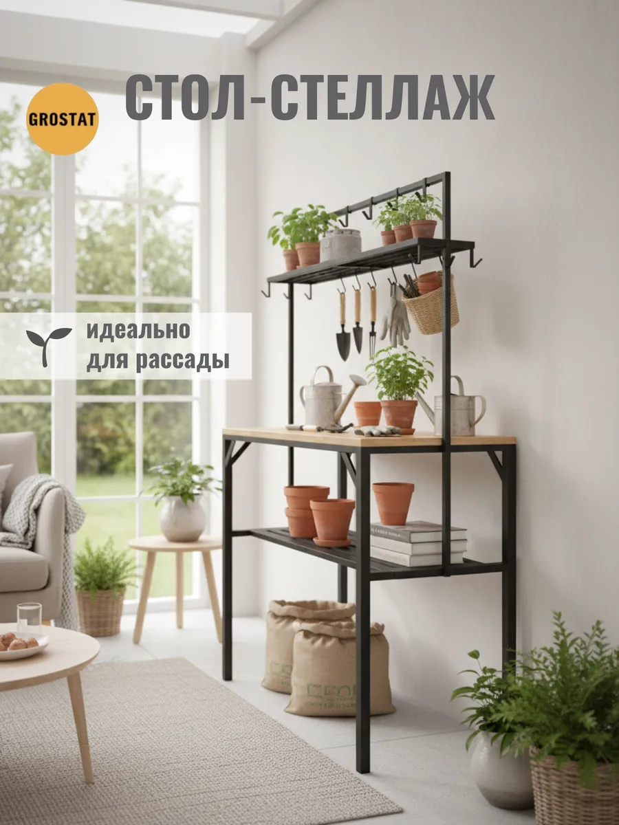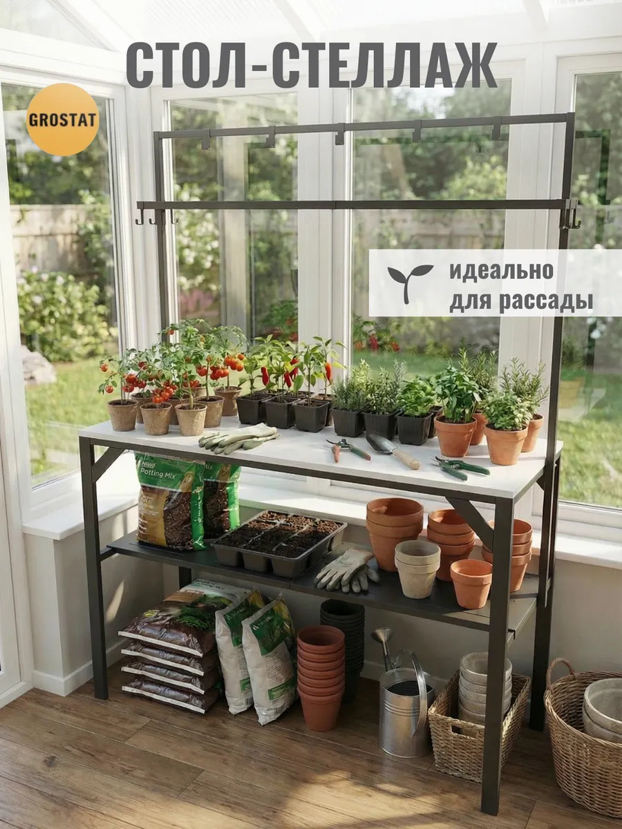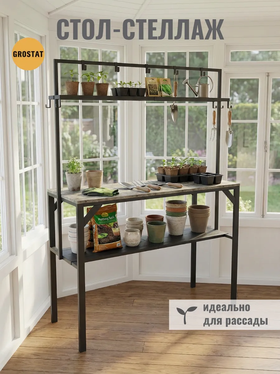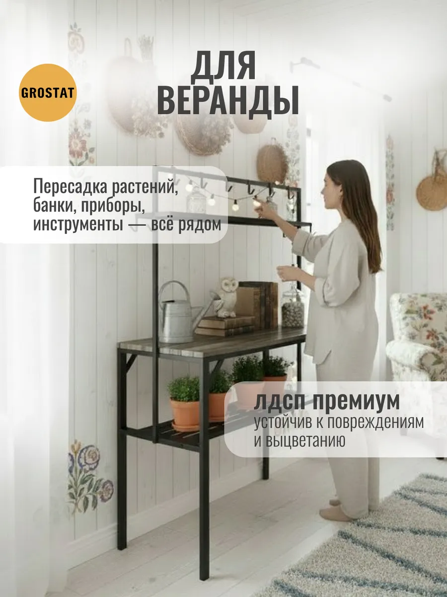 Большая рабочая поверхность отлично подходит для приготовления еды, сервировки обедов, рукоделия, шитья, пересадки растений и других бытовых задач. Под столешницей расположены удобные полки для хранения посуды, кухонной утвари и садового инвентаря, а над столешницей — дополнительные открытые полки и металлические крючки для аксессуаров, полотенец, садовых инструментов или швейных принадлежностей.