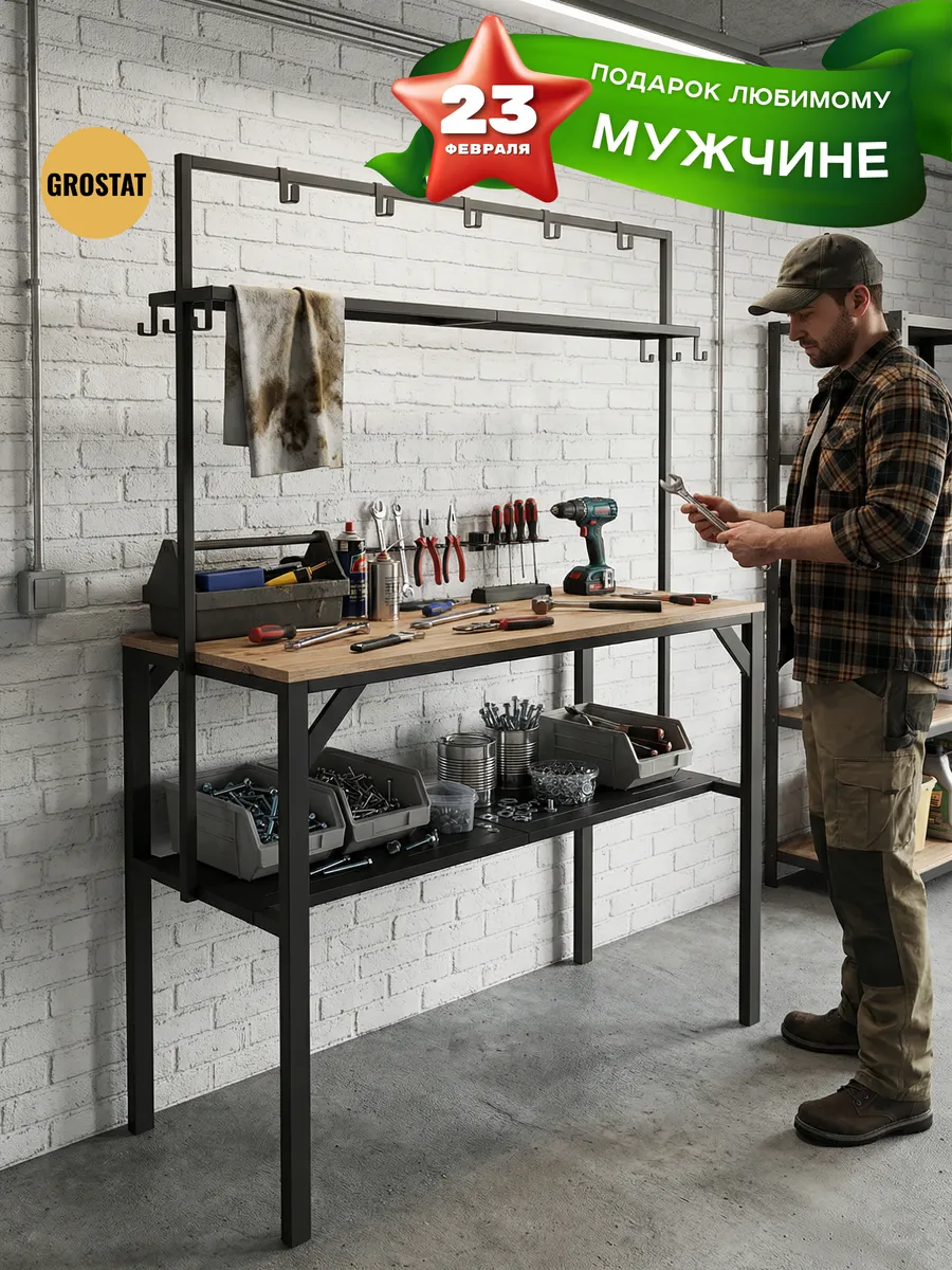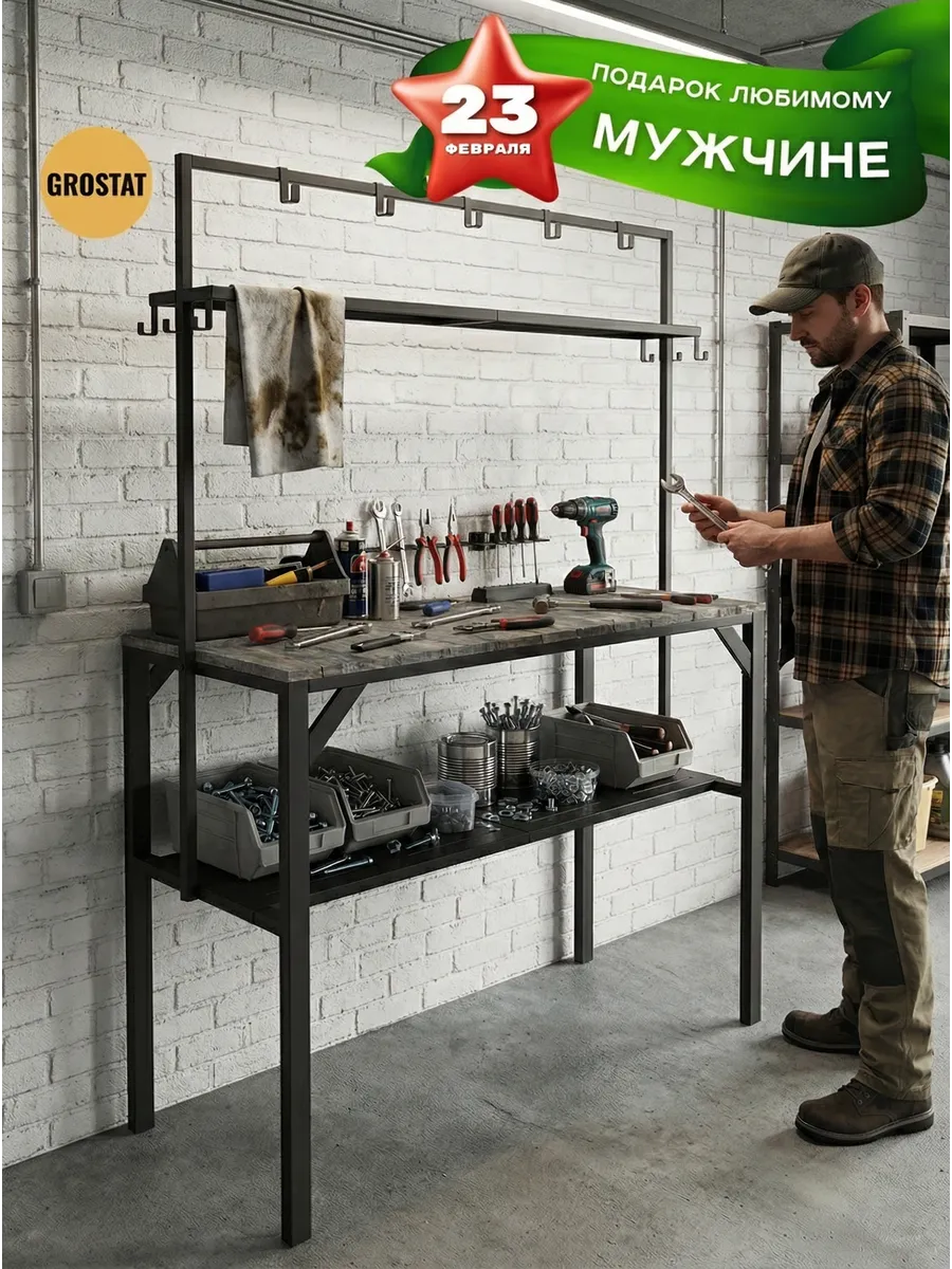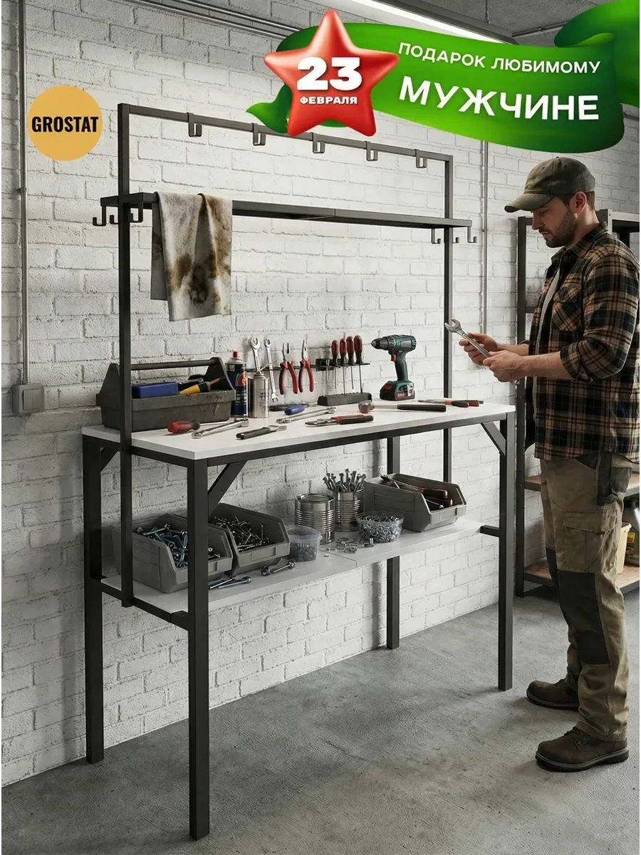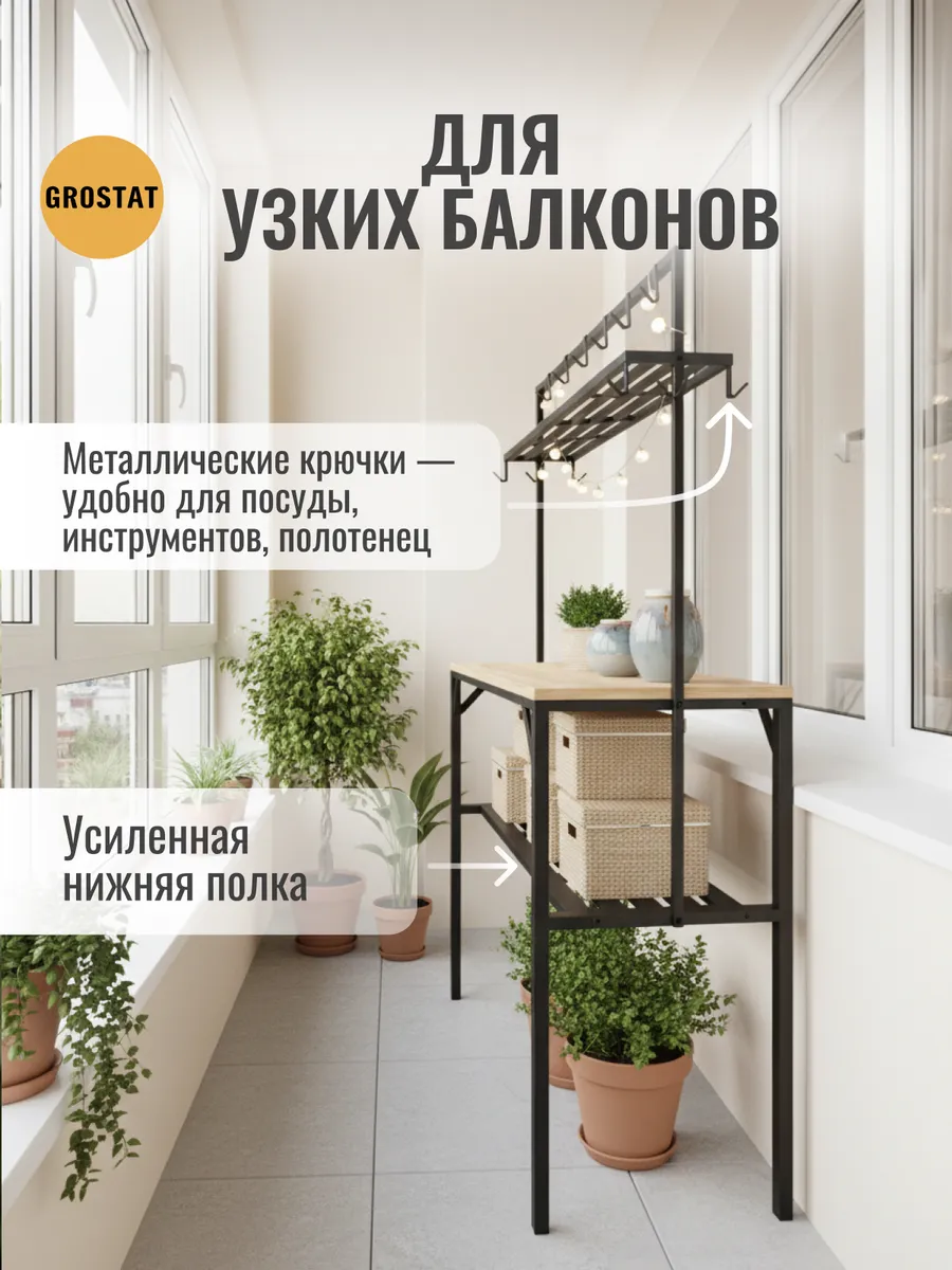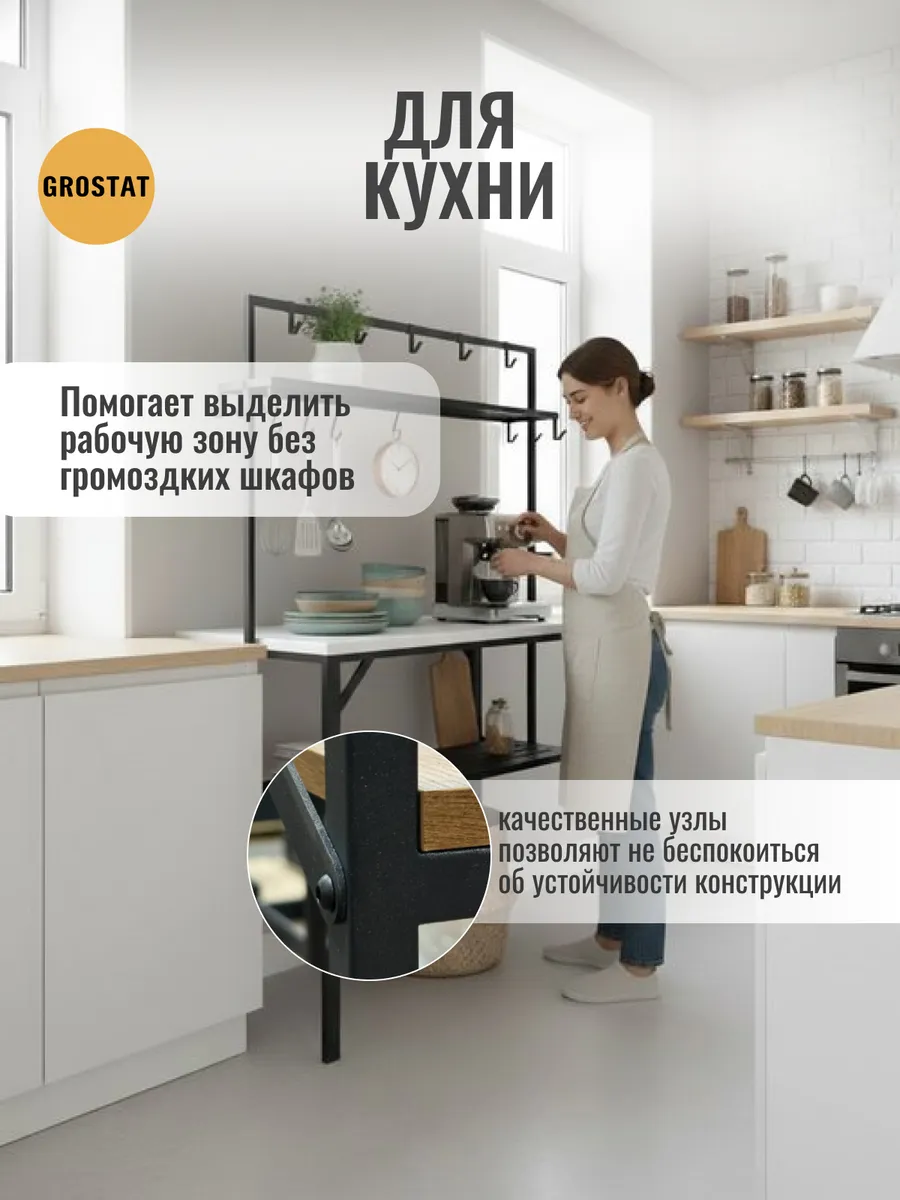 Большая рабочая поверхность отлично подходит для приготовления еды, сервировки обедов, рукоделия, шитья, пересадки растений и других бытовых задач. Под столешницей расположены удобные полки для хранения посуды, кухонной утвари и садового инвентаря, а над столешницей — дополнительные открытые полки и металлические крючки для аксессуаров, полотенец, садовых инструментов или швейных принадлежностей.