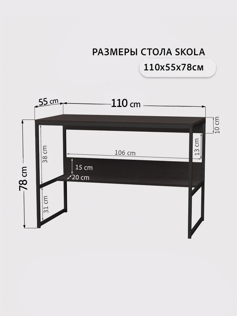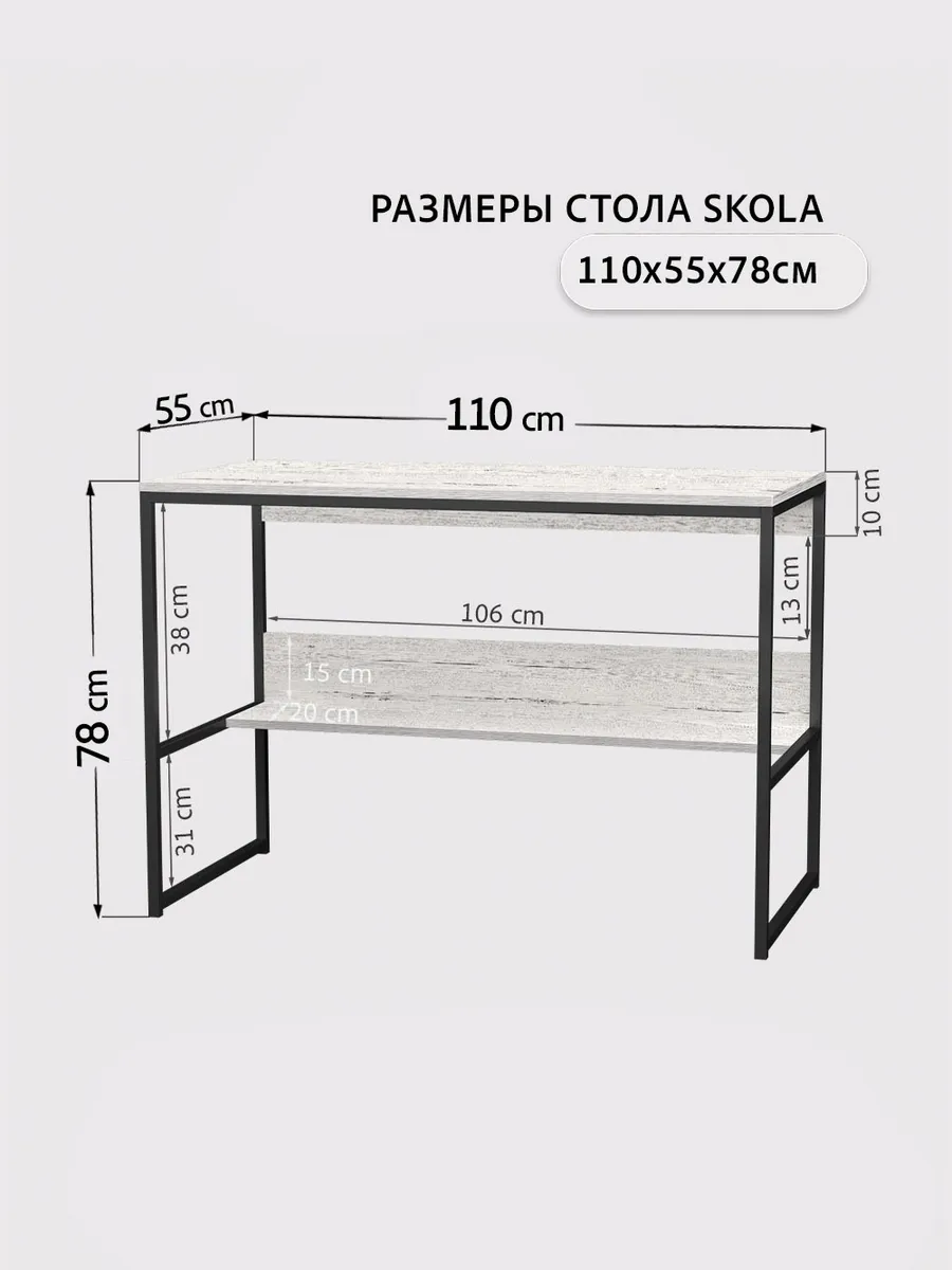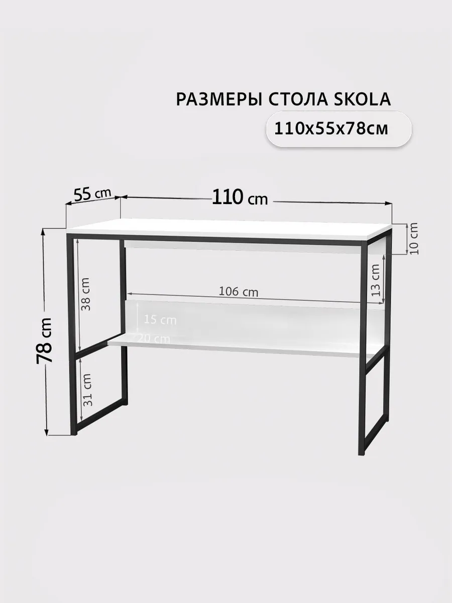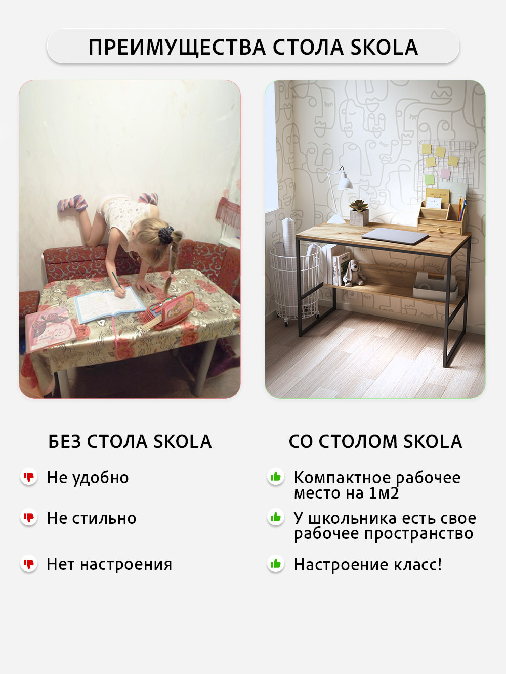 Стол SKOLA также обладает прочной металлической рамой, которая обеспечивает стабильность и надежность конструкции. Металлическая конструкция выполнена из профильной трубы 20 х 20 мм, что позволяет выдерживать нагрузку 50 кг. Стол усилен соединяющейся полкой, благодаря которой он сохраняет устойчивое положение. Эта деталь выделяет его из других моделей и придает ощущение надежности при использовании. Столешница изготовлена из высококачественного ЛДСП , специальное ламинированное покрытие делает ее ударопрочной и не царапающейся, а также защищает от влаги. Металлический каркас крепится к столешнице с помощью шуруповерта и саморезов, крепления входят в комплектацию.