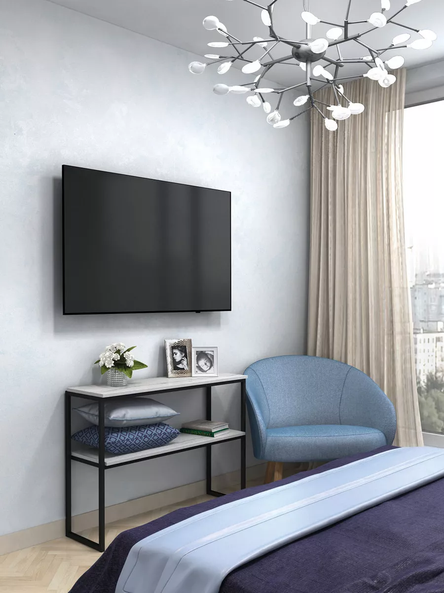 Туалетный столик без зеркала выполнен из прочного металлического каркаса 20х20 мм, каркас окрашен в стойкую порошковую краску черного матового цвета. Столешница у столика изготовлена из качественного ламинированного ЛДСП, что позволяет защитить столешницу от влаги и царапин. Толщина полок 16мм. Ширина и высота полочек позволяет удобно и достаточно вместительно разместить вещи или аксессуары. Столик консоль достаточно крепкий и выдерживает нагрузку до 40 кг на каждую полку.