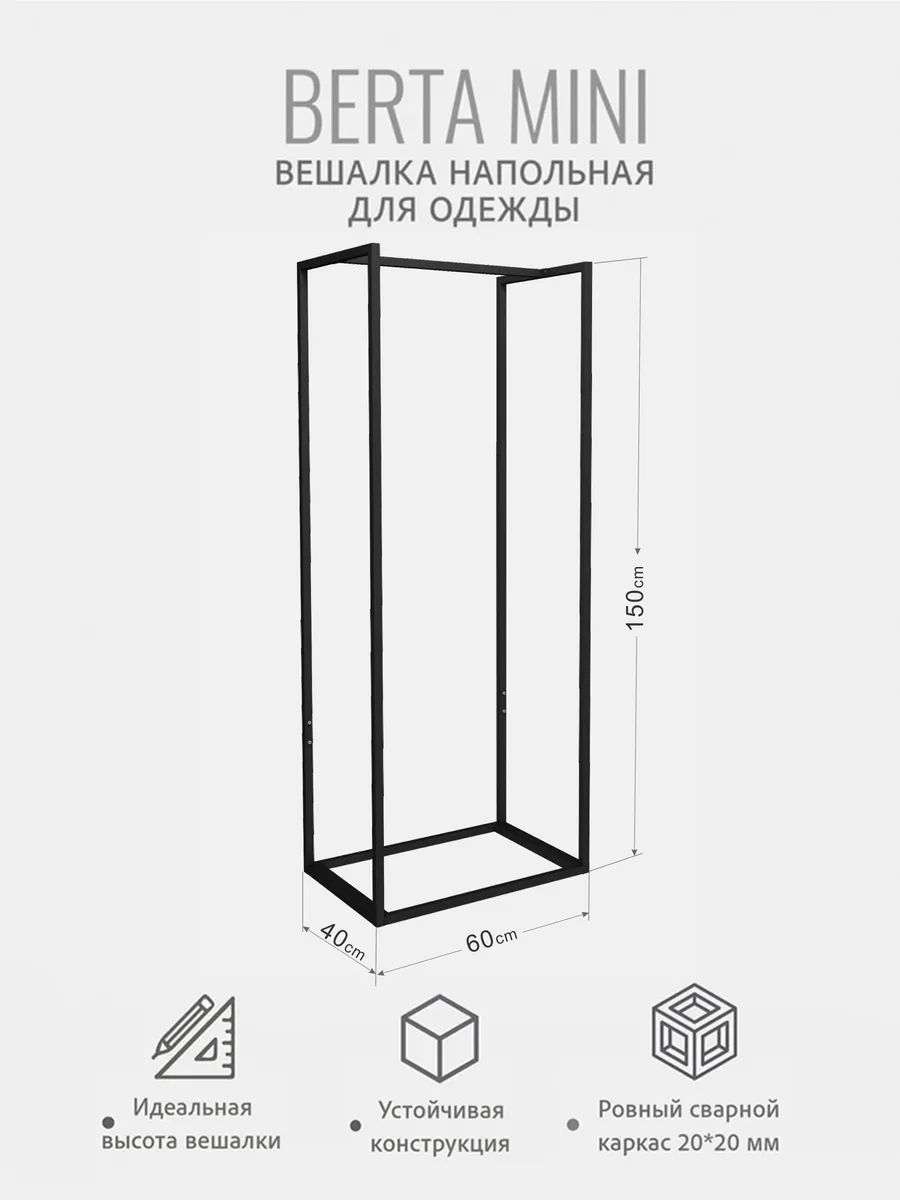 Конструкция вешалки рейл изготовлена из цельносварного металлического каркаса, что позволяет выдерживать нагрузку 40 кг. Каркас напольной вешалки выполнен из квадратной трубы 20х20мм окрашен первосортной порошково-полимерной черной матовой краской, которая не облезает и не ржавеет, поэтому вешалку стойку можно ставить в помещения с повышенной влажностью, такие как сауна, бассейн, спортзал с моющим отделением. Конструкция вешалки разборная, собирается с помощью шуруповерта и саморезов, саморезы входят в комплектацию. Простота и легкость конструкции позволяет без труда разобрать и собрать вешалку. Вешалка напольная стойка для одежды Berta mini имеет размеры: высота 150 см, ширина 60 см, глубина 40 см.