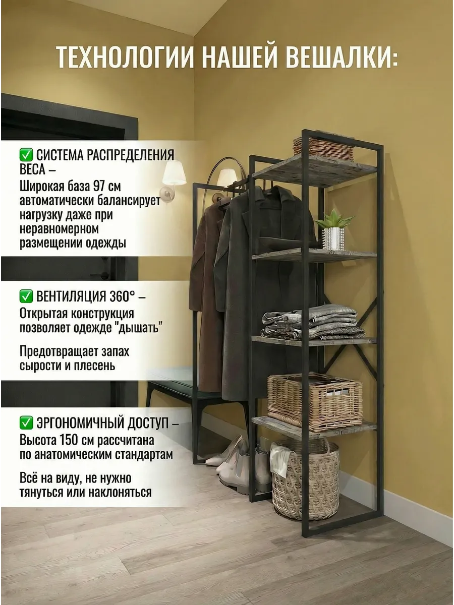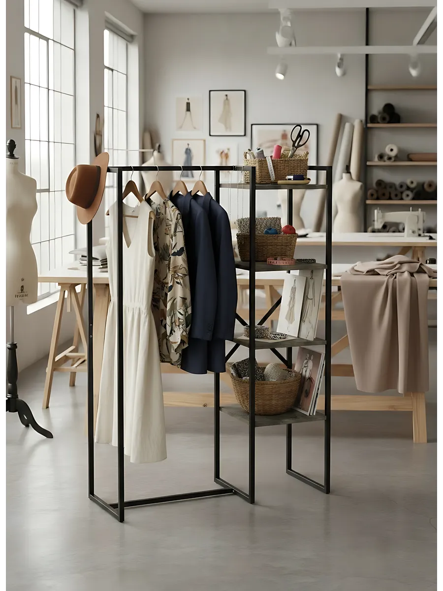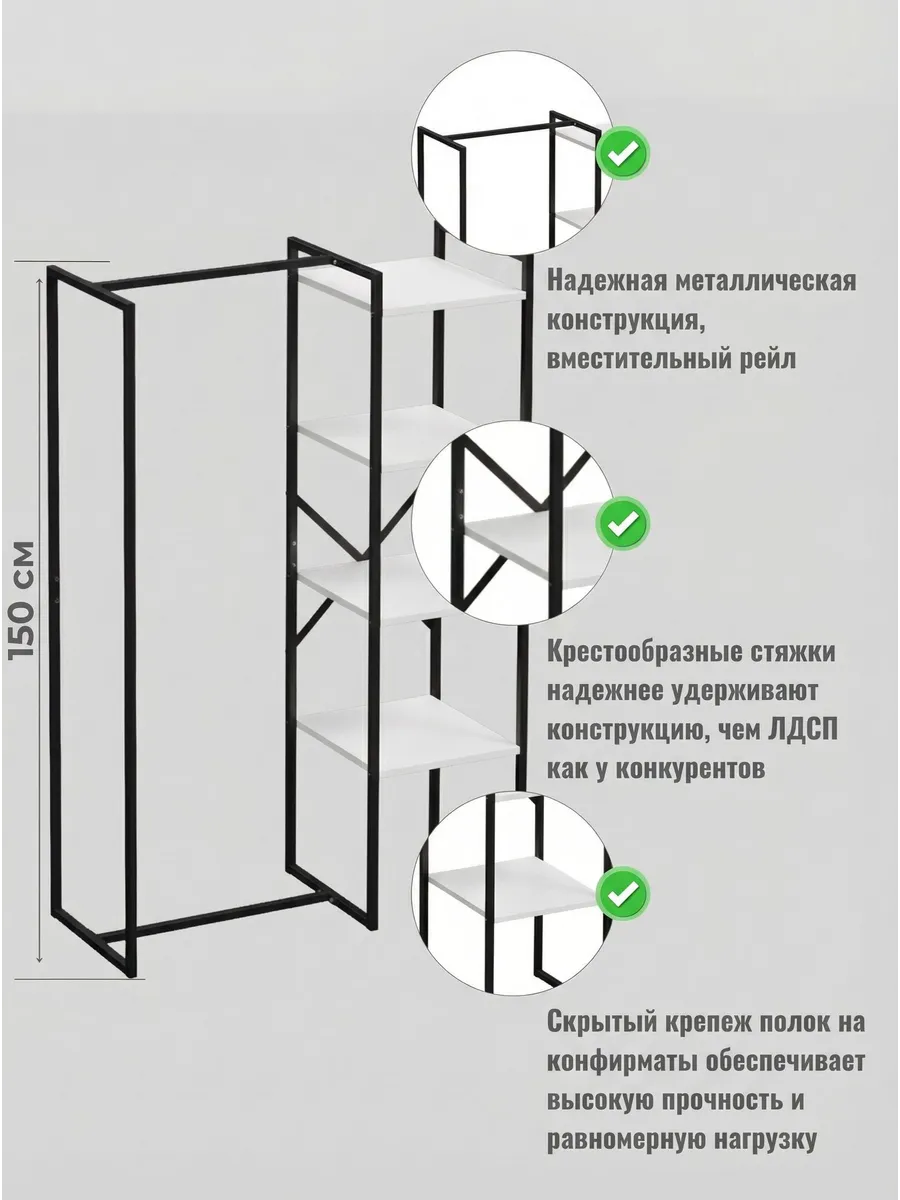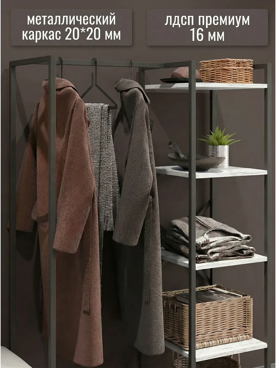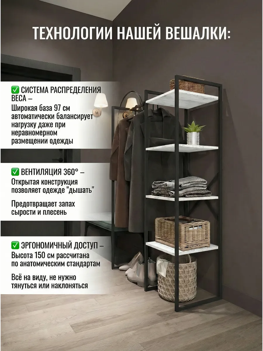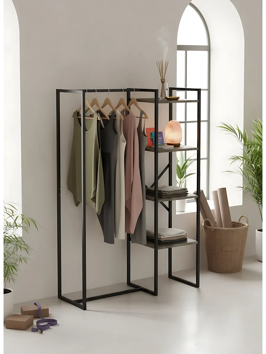 Представляем вашему внимаю напольyую гардеробную систему LUCID. Эта уникальная модель гардеробной вешалки с полками представляет собой идеальное сочетание современного дизайна, практичности и многофункциональности. Её минималистичный стиль органично вписывается в любое помещение, будь то уютная спальня, просторная гардеробная или небольшая прихожая. Разборная конструкция позволяет легко собрать изделие с помощью обычных инструментов, таких как шуруповерт и саморезы, которые идут в комплекте, что делает процесс сборки простым и быстрым. Гардеробная вешалка оснащена удобными полками, предназначенными для хранения различных вещей, начиная от повседневных аксессуаров и заканчивая обувью. Это позволяет оптимально использовать пространство и поддерживать порядок в вашем гардеробе. Кроме того, специальные рейлы в стиле лофт обеспечивают удобное размещение верхней одежды, брюк и юбок.