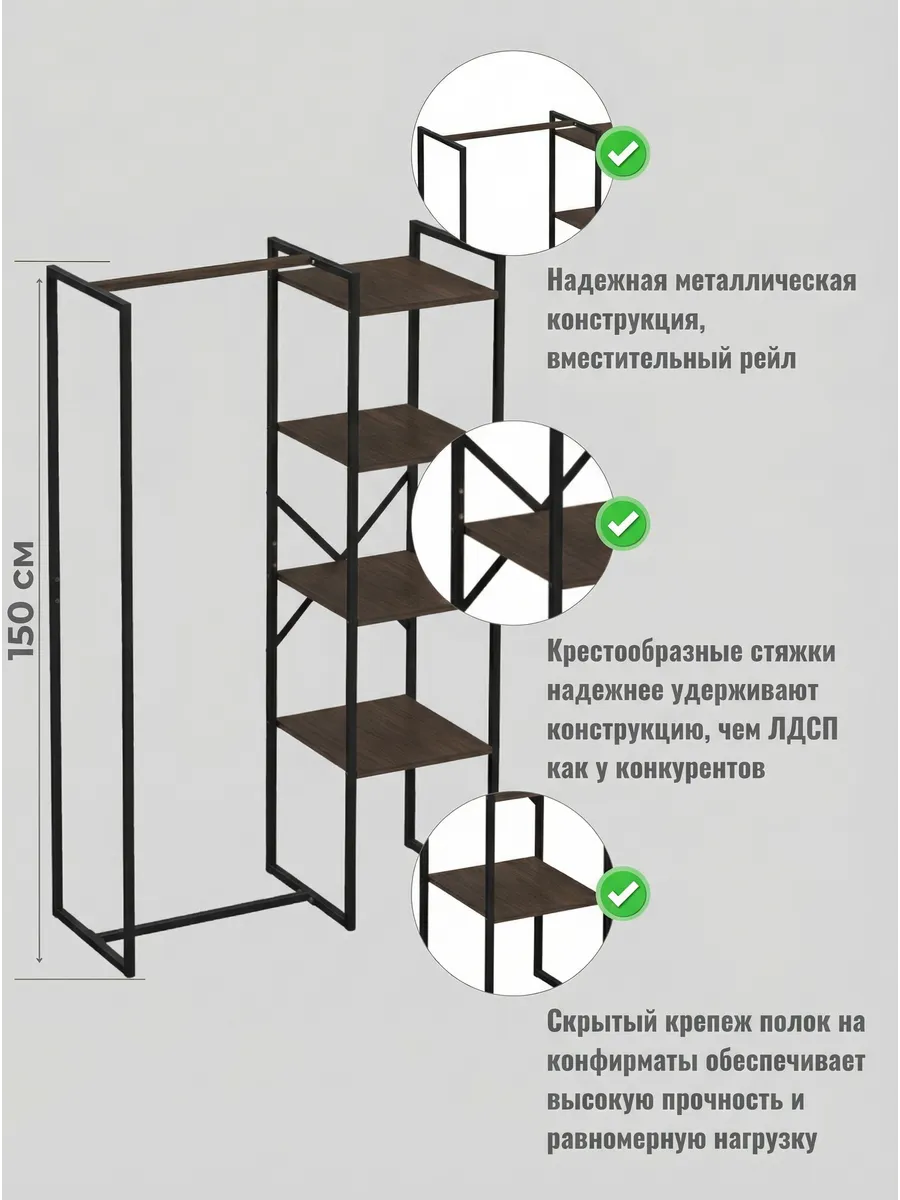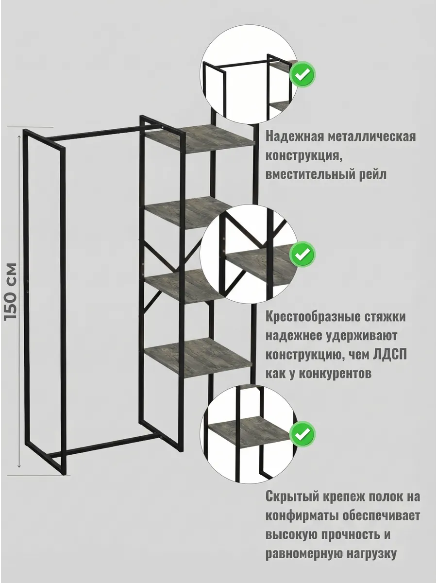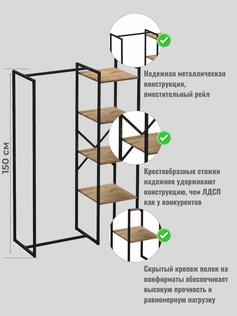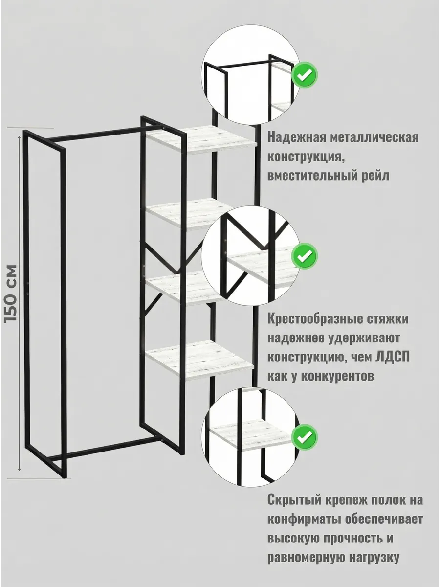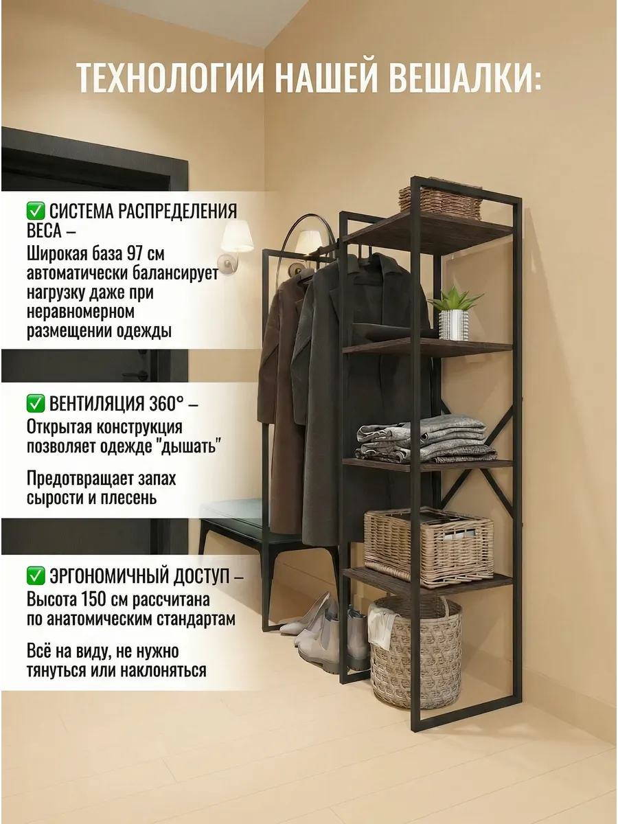 Представляем вашему внимаю напольyую гардеробную систему LUCID. Эта уникальная модель гардеробной вешалки с полками представляет собой идеальное сочетание современного дизайна, практичности и многофункциональности. Её минималистичный стиль органично вписывается в любое помещение, будь то уютная спальня, просторная гардеробная или небольшая прихожая. Разборная конструкция позволяет легко собрать изделие с помощью обычных инструментов, таких как шуруповерт и саморезы, которые идут в комплекте, что делает процесс сборки простым и быстрым. Гардеробная вешалка оснащена удобными полками, предназначенными для хранения различных вещей, начиная от повседневных аксессуаров и заканчивая обувью. Это позволяет оптимально использовать пространство и поддерживать порядок в вашем гардеробе. Кроме того, специальные рейлы в стиле лофт обеспечивают удобное размещение верхней одежды, брюк и юбок.